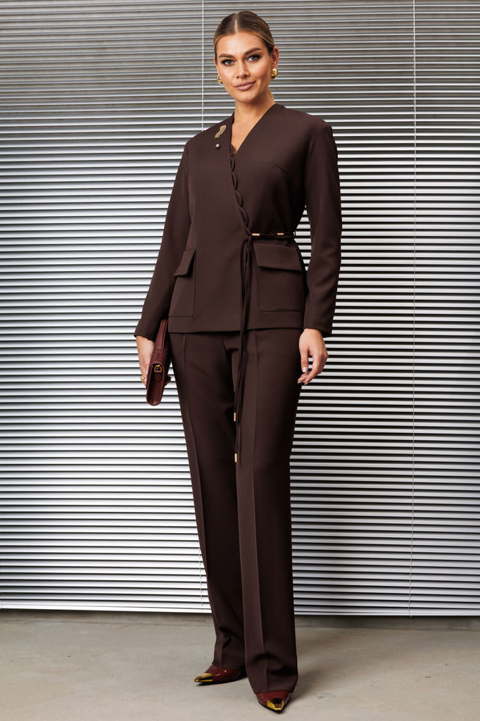 Состав: Вискоза-23%; ПЭ-75%; Спандекс-2%; Брючный костюм, состоящий из жакета и брюк, представляет собой стильный и современный ансамбль, идеально подходящий для различных случаев. Жакет свободного кр... Показать описаниеоя оснащен двубортной застежкой на потайную кнопку, что придает ему элегантный вид. Спинка выполнена со средним швом, а передняя часть украшена нагрудными вытачками и крупными накладными карманами с клапанами, добавляющими практичности. V-образный вырез горловины создает визуальный акцент, а край борта, декорированный воздушными петлями, придает жакету легкость и изящество. Линия плеча спущена, что добавляет расслабленности, а рукав рубашечного покроя обеспечивает комфорт. Особым элементом дизайна является шнур вокруг талии с металлической фурнитурой, который можно регулировать для создания идеальной посадки. Жакет также дополнен съемной брошью, что позволяет варьировать стиль. Внутренняя подкладка обеспечивает дополнительный комфорт. Брюки прямого кроя с заутюженными стрелками подчеркивают строгость образа. Боковые карманы добавляют функциональности, а застежка в среднем шве и притачной пояс с резинкой сзади гарантируют удобную посадку. Этот костюм станет отличным выбором для офисной обстановки или деловых встреч, сочетая в себе элегантность и современный подход к классическому стилю. длина жакета по спинке: 68см длина рукава: 58 см длина брюк: 108 см