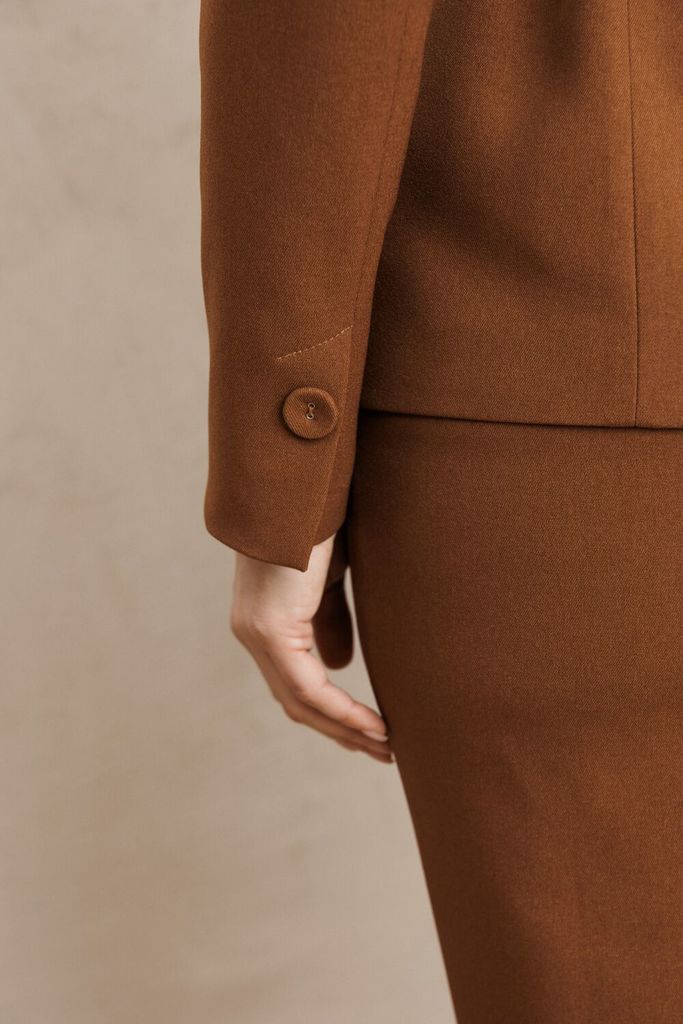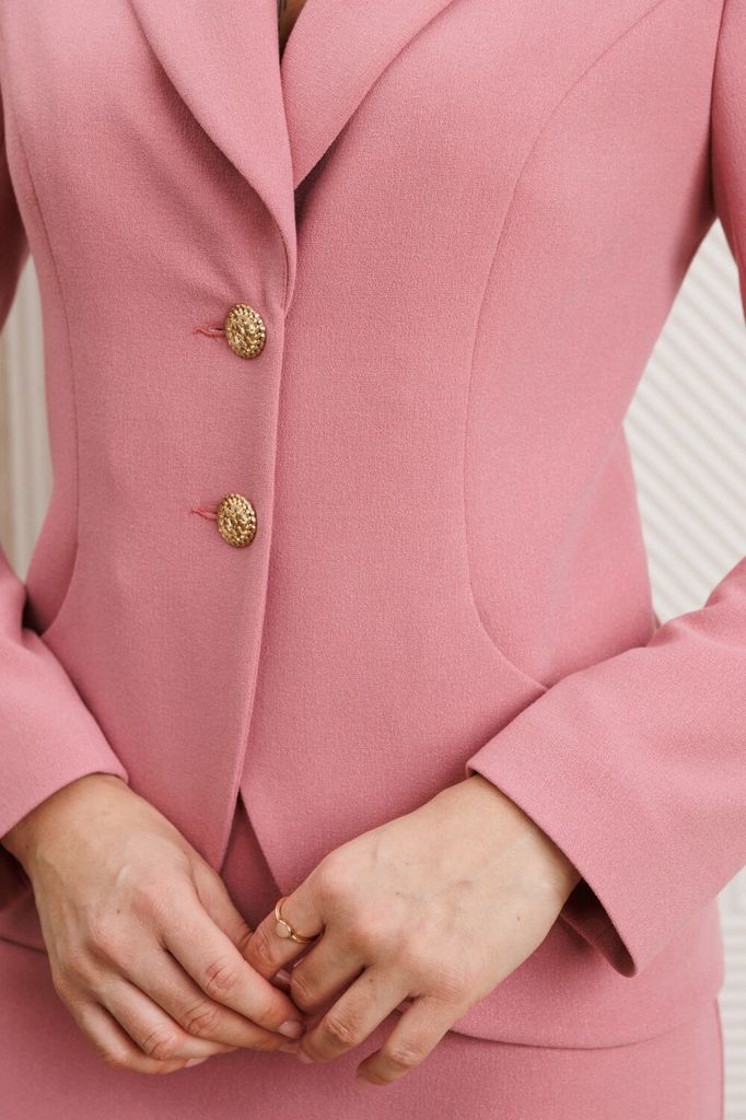 Состав: Вискоза-23%; ПЭ-75%; Спандекс-2%; Жакет полуприлегающего силуэта с двубортной застёжкой на одну пару обтяжных, из основной ткани, пуговиц и одной потайной. Край борта фигурной формы,придающей ... Показать описаниединамичность жакету. На полочке выполнены фигурные рельефы, которые дополнены функциональными карманами, гармонично вписывающимися в общую структуру изделия. Спинка со средним швом и вертикальными рельефами из проймы. Воротник с цельнокроенной стойкой, что придает жакету элегантный и строгий вид. Рукава двухшовные, со шлицей в локтевом шве на одну пуговицу, также обтяжную из основной ткани.Жакет дополнен шлёвками и съемным поясом из основной ткани с пятью блочками на обтяжную пряжку, чем придает дополнительный акцент на талии. Жакет на подкладке. Юбка, длиной ниже колена, зауженная к низу. Застёжка в левом боковом шве на потайную молнию и пуговицу. На переднем и заднем полотнище юбки обработаны талевые вытачки, которые обеспечивают точную посадку по фигуре. Юбка на поясе, сзади частично на резинке для удобства и комфортной посадки.В среднем шве юбки обработана шлица, которая обеспечивает свободу движений. Юбка также на подкладке. Костюм выполнен из качественной костюмной ткани, что придает изделию прочность и долговечность, а также создает элегантный и современный образ, подходящий для различных деловых мероприятий и повседневной носки. длина жакета по спинке: 63,5см длина рукава: 62 см длина юбки с поясом: 77,5 см Замеры 46-52: Жакет Длина спинки 63,5 63,5 63,5 63,5 Ширина спинки 38 39 40 41 Ширина на уровне глубины проймы 49 51 53 55 Ширина по линии талии 46 48 50 52 Ширина по линии бедер 53 55 57 59 Длина рукава 62 62 62 62 Ширина рукава вверху 17 18 19 20 Ширина плеча 12,0 12,5 13 13 Юбка Длина по боковому шву (с поясом) 77,5 77,5 77,5 77,5 Ширина по линии талии 42 43 45 47 Ширина по линии бедер 50 52 54 56 В размерах 52-54 застежка смещенная, на три пуговицы.
