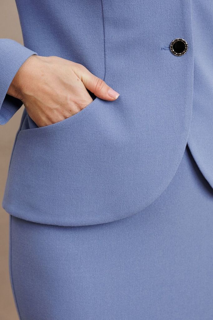 Состав: Вискоза-33%; ПЭ-65%; Спандекс-2%; Костюм включает в себя стильный жакет и элегантную юбку. Жакет выполнен в полуприлегающем силуэте с центральной застежкой на пуговицы, что придает ему аккурат... Показать описаниеный вид. Спинка жакета имеет средний шов, а передняя часть украшена вертикальными рельефами и накладными карманами с пуговицей. Округлая горловина дополнена кантами по краю, что создает изящный акцент. Рукава длиной 3/4 слегка расширяются к низу и оформлены отделкой в виде цветка из отделочного материала, добавляя индивидуальности. Юбка имеет зауженный к низу силуэт и удобно сидит на притачном поясе с резинкой, обеспечивая комфорт. Молния и шлица расположены в среднем шве. Весь костюм подкладке, что придает ему дополнительный комфорт и завершенность. Замеры 46-52: Жакет Длина спинки 54 54 54 54 Ширина спинки 38 39 40 41 Ширина на уровне глубины проймы 51 53 55 57 Ширина по линии талии 47 49 51 53 Длина рукава 47 47 47 47 Ширина по линии бедер 52 54 56 58 Ширина рукава вверху 18 19 20 21 Ширина плеча 12 13 13 13 Юбка Длина по боковому шву 78 78 78 78 Ширина по линии талии 39 41 43 45 Ширина по линии бедер 51 53 55 57