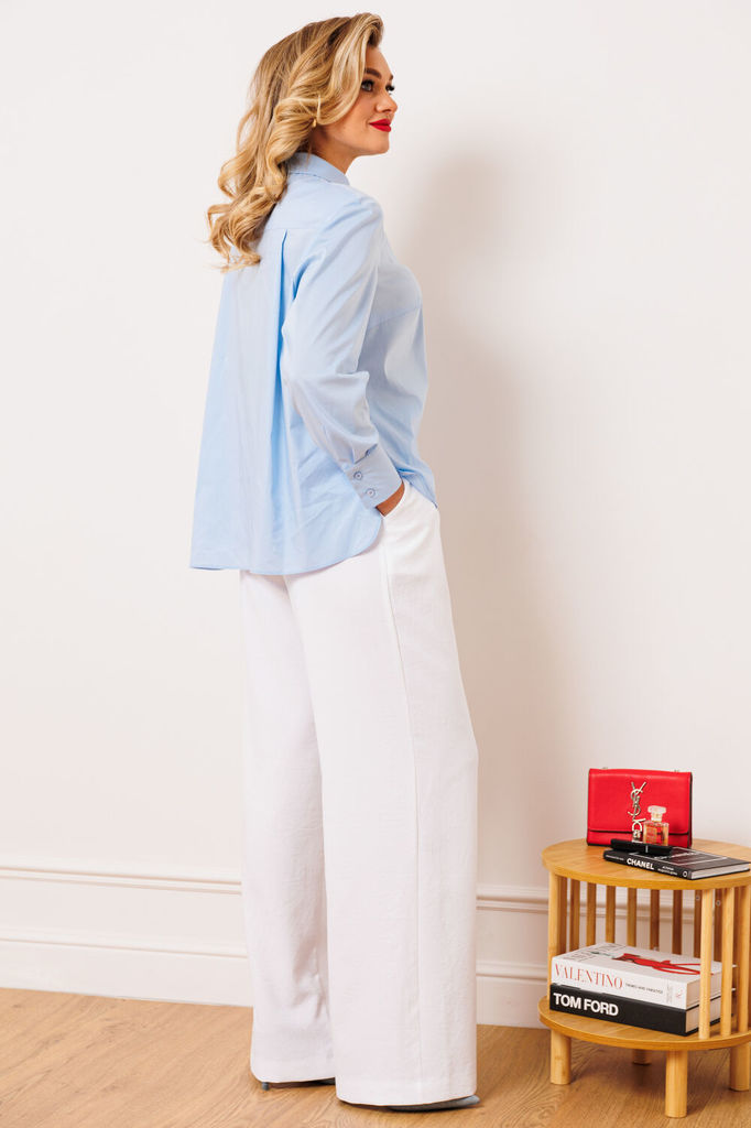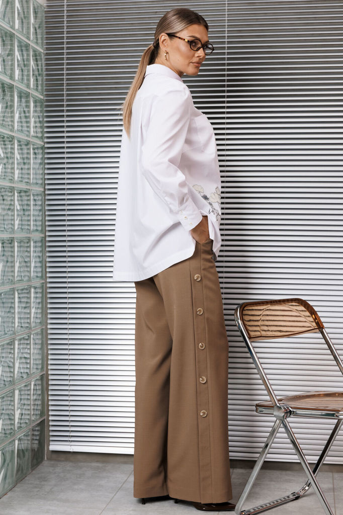 Состав: Вискоза-33%; ПЭ-65%; Спандекс-2%; Брюки прямого широкого кроя гармонично дополняют рубашку, создавая стильный ансамбль. Сбоку расположенные лампасы с отделкой из пуговиц добавляют акцент и изы... Показать описаниесканность, а боковые карманы делают модель функциональной. Застежка в среднем шве и притачной пояс с резинкой сзади обеспечивают комфортную посадку и удобство в носке. Эти брюки легко комбинируется с различной обувью и аксессуарами, позволяя создавать разнообразные образы для работы, встреч и повседневной жизни. Мы предлагаем их в тандеме с рубашкой из новой коллекции (арт. 2929bl). Замеры 46-52: Длина по боковому шву (с поясом) 113 113 113 113 Ширина по линии талии 39 41 43 45 Ширина по линии бедер 52 54 56 58
