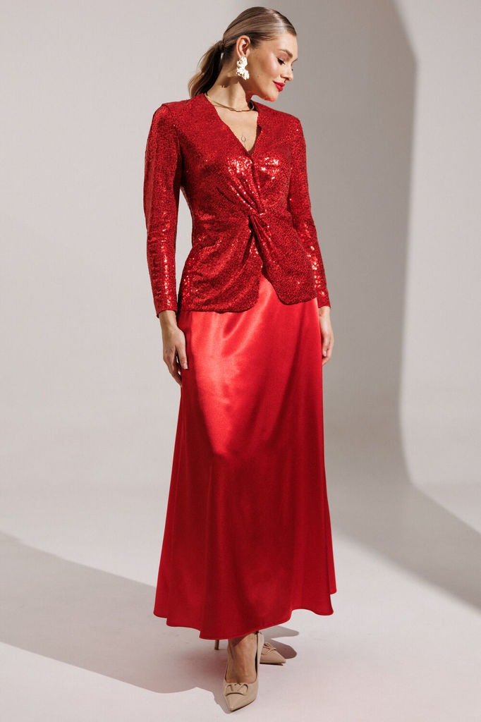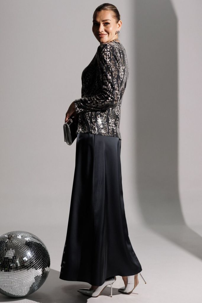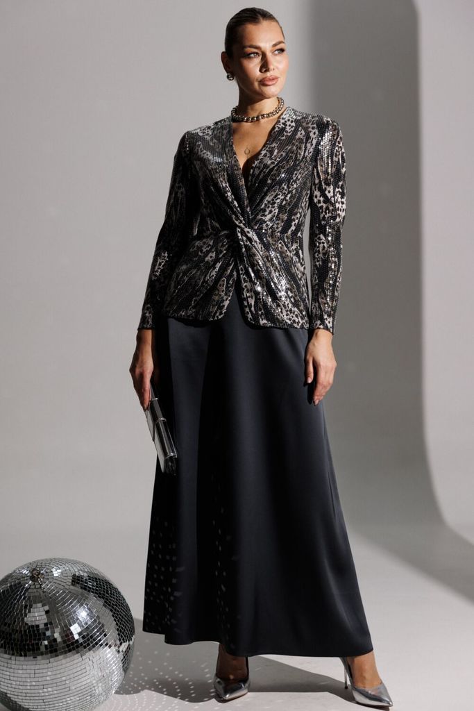 Состав: Блуза: ПЭ-96%; Спандекс-4%; Юбка: ПЭ-100%; Продолжением нашей нарядной коллекции является роскошный комплект, состоящий из блузы, имитирующей жакет, и невероятной струящейся юбки из атласа дли... Показать описаниены макси. Блуза из ткани в пайетки с декоративным узлом в области талии. V-образный вырез. Блуза приталенного силуэта с втачными, двухшовными рукавами. Блуза частично на подкладке. Юбка на поясе с резинкой. Замеры 48-54: Блуза Длина спинки 62 62 62 62 Ширина спинки 19,5 20 20,5 21 Ширина на уровне глубины проймы 50 52 54 56 Ширина по линии талии 42 44 46 48 Длина рукава 57 57 57 57 Ширина по линии бедер 53 55 57 59 Ширина рукава вверху 17 17,5 18 18,5 Ширина плеча 12,3 12,5 12,7 12,9 Юбка Длина по боковому шву 102 102 102 102 Ширина по линии талии 42 44 46 48