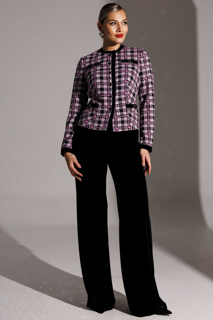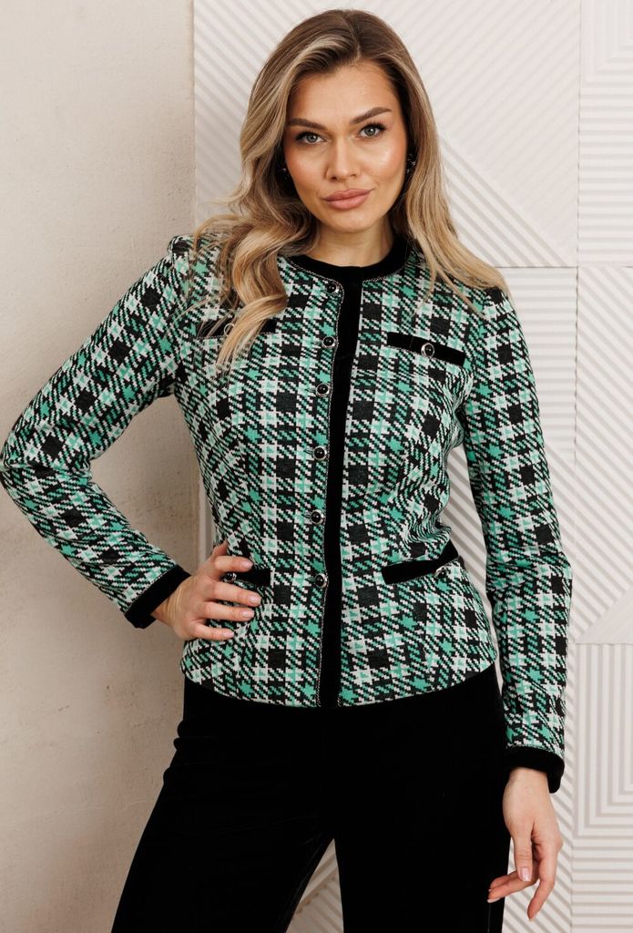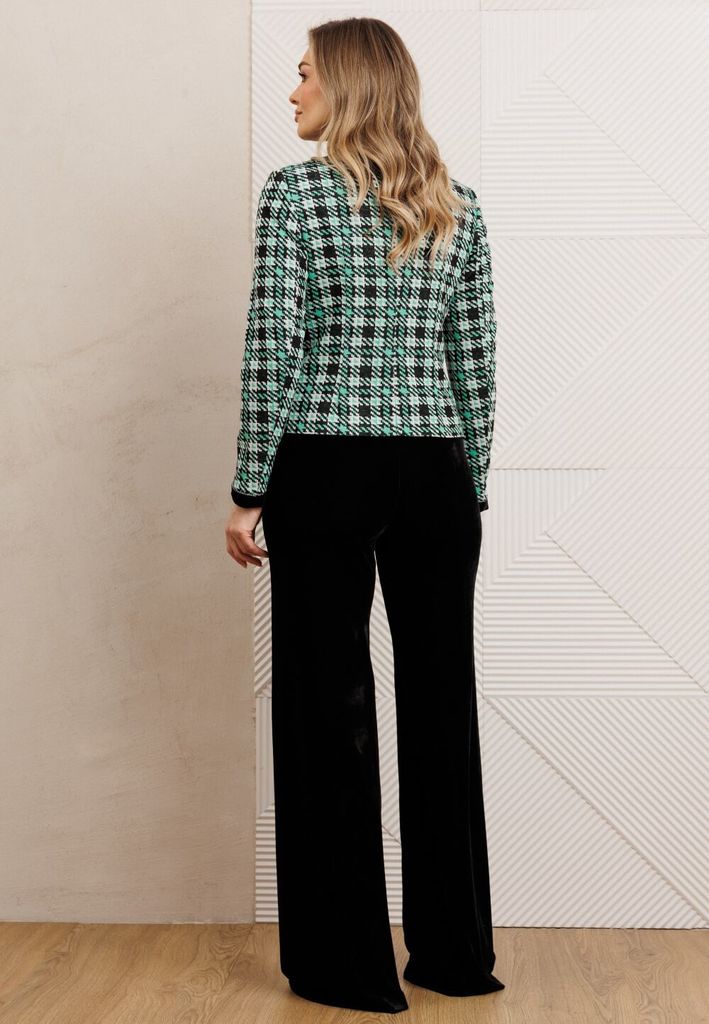 Состав: Жакет: Вискоза-33%; ПЭ-65%; Спандекс-2%; Брюки: ПЭ-95%; Спандекс-5%; Брючный костюм в стиле Шанель представляет собой элегантное сочетание классики и современности. Жакет выполнен из трикотажн... Показать описаниеого полотна с актуальным принтом «гусиная лапка», имеет полуприлегающий силуэт и центральную застежку на пуговицы. Спинка оформлена средним швом и талиевыми вытачками, что обеспечивает идеальную посадку. Передняя часть также украшена талиевыми вытачками, а округлая горловина подчеркивает женственность образа. Функциональные карманы с листочками расположены внизу, в то время как имитация карманов в верхней части переда добавляет изюминку. Листочки на карманах и планка горловины выполнены из бархата с отделкой по краям, создавая контраст текстур. Рукава втачные, двухшовные, с планкой по низу, также отделанной бархатом. Жакет на подкладке, что обеспечивает комфорт при носке. Брюки палаццо из бархата имеют стильные широкие штанины и удобную резинку на поясе, что делает этот костюм идеальным выбором как для деловых встреч, так и для вечерних выходов. Замеры 46-52: Жакет Длина спинки 56 56 56 56 Ширина спинки 38 39 40 41 Ширина на уровне глубины проймы 50 52 54 56 Ширина по линии талии 45 47 49 51 Длина рукава 61 61 61 61 Ширина по линии бедер 50 52 54 56 Ширина рукава вверху 17 18 19 20 Ширина плеча 12,5 13,5 13,5 13,5 Брюки Длина по боковому шву 112 112 112 112 Ширина по линии талии 41 43 45 47 Ширина по линии бедер 48 50 52 54