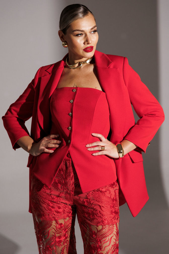 Состав: ПЭ-97%; Спандекс-3%; Капсула RED CODE - Ваша формула смелого праздника. Она создана для особых случаев включает в себя жакет, корсет и брюки, создавая элегантный и стильный образ. Жакет выполн... Показать описаниеен в классическом стиле с полуприлегающим силуэтом. Он удлиненный, имеет центральную застежку на одну пуговицу и элегантные детали, такие как спинка с средним швом и шлицей, а также перед с талиевыми вытачками и наклонными карманами с клапанами. Воротник пиджачного типа добавляет строгости, а втачные двухшовные рукава длиной 3/4 со шлицей в локтевом шве и пуговицей придают жакету изысканный вид. Жакет на подкладке. Мы собрали все элементы новогодней коллекции в единую капсулу, где каждая вещь - не просто предмет гардероба, а часть большой стилистической головоломки. Собирайте образы как конструктор, меняйтесь в течение вечера и будьте неотразимы в каждой роли! Замеры 44-50: Длина спинки 78 78 78 78 Ширина спинки 36,5 37,5 38,5 39,5 Ширина на уровне глубины проймы 49 51 53 55 Ширина по линии талии 47 49 51 53 Длина рукава 50 50 50 50 Ширина по линии бедер 51 53 55 57 Ширина рукава вверху 15,5 16,5 17,5 18,5 Ширина плеча 12 12 12 12