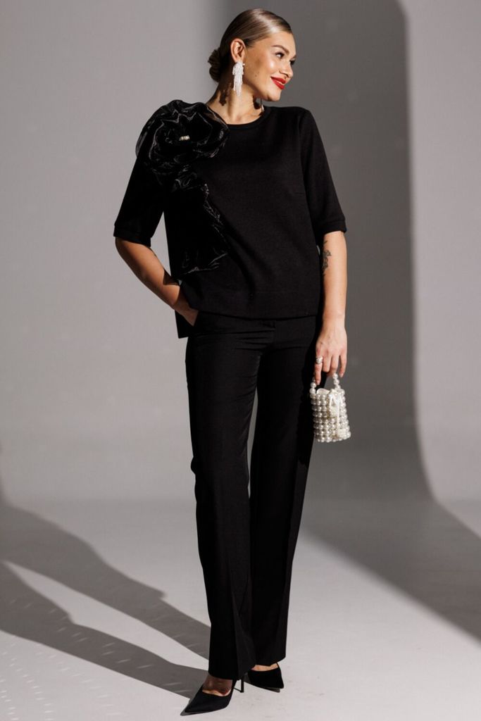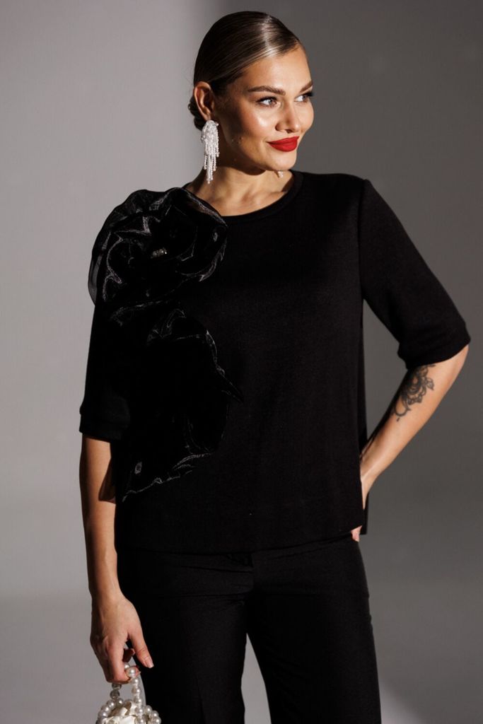 Состав: Блуза: ПЭ-70%; Спандекс-10%; Шерсть-20%; Брюки: ПЭ-96%; Спандекс-4%; Создать нарядный образ с брюками возможно вместе с нашей новинкой ! Комплект состоит из блузы и брюк. Блуза выполнена из то... Показать описаниенкого, струящегося трикотажа, имеющего в составе ангору. Блуза полуприлегающего силуэта, по низу с перепадом длины. Перед декорирован акцентным дизайнерским цветком из органзы. Рукав втачной с манжетой. Брюки классические, прямого силуэта, с заутюженными стрелками, боковыми карманами шлевками для ремня. Замеры 46-54: Блуза Длина спинки 67 67 67 67 67 Ширина спинки 39 41 42 43 44 Ширина на уровне глубины проймы 51 53 55 57 59 Ширина по линии талии 48 50 52 54 56 Длина рукава 33 33 33 33 33 Ширина по линии бедер 53 55 57 59 61 Ширина рукава вверху 16 17 18 19 20 Ширина плеча 9,5 9,5 9,5 9,5 9,5 Брюки Длина по боковому шву 109 109 109 109 109 Ширина по линии талии 40 42 44 46 48 Ширина по линии бедер 51 53 55 57 59