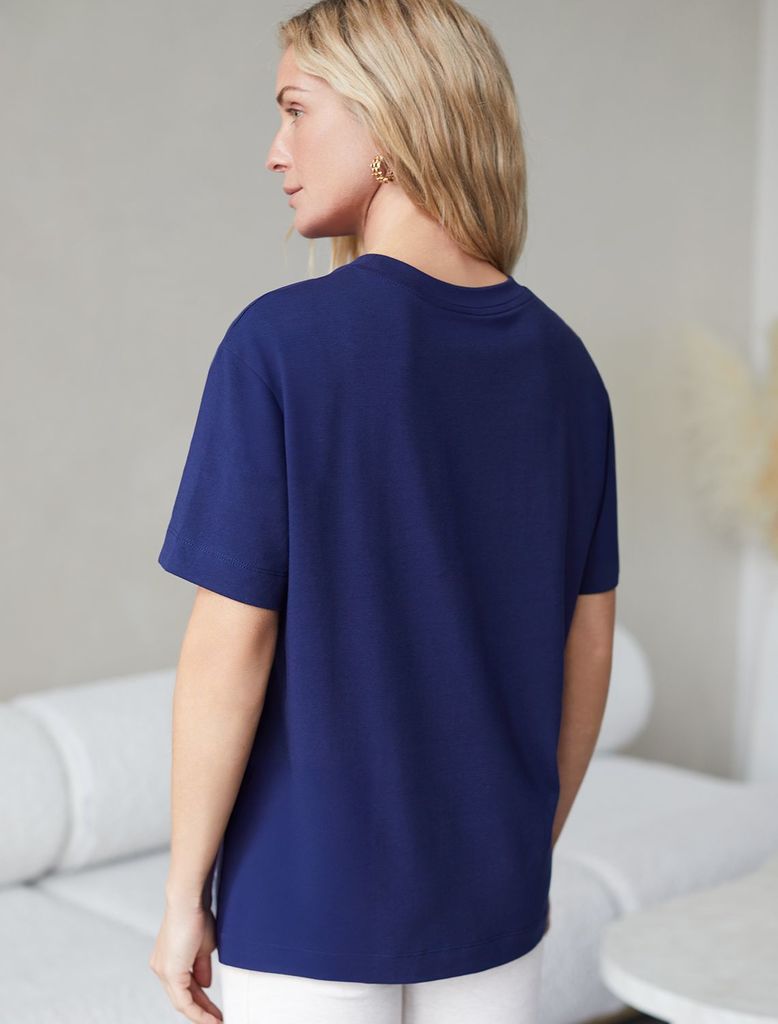 Состав: 92%Хлопок 8%ПУ Плотность: 170 Г/м2 Размер товара на первом фото: 42 Футболка темно-синего цвета изготовлена из премиального хлопка с эластаном, она обеспечивает невероятное ощущение уюта и лег... Показать описаниекости. Натуральный материал сохраняет форму и цвет после множества стирок, обеспечивая долговечность изделия, а его высокая воздухопроницаемость создает ощущение свежести даже в течение долгого дня. Особое внимание привлекает стильный принт в виде ягод вишни с минималистичной надписью. Перевод надписи: Always and Forever Moncheri - Всегда и Навсегда Мончери. Принт выполнен красками с устойчивым покрытием, который добавляет изделию оригинальности и позволяет выразить индивидуальность. Свободный крой футболки дарит удобство и не стесняет движений, что делает ее идеальной для повседневной носки или активного отдыха, подчеркивает современный взгляд на моду. На рукаве металлический логотип бренда. Подойдет девушкам и женщинам на любую фигуру, вы будете чувствовать себя в ней уверенно и комфортно. Отлично впишется в гардероб благодаря универсальному дизайну, который легко сочетать с джинсами, шортами или спортивными брюками.