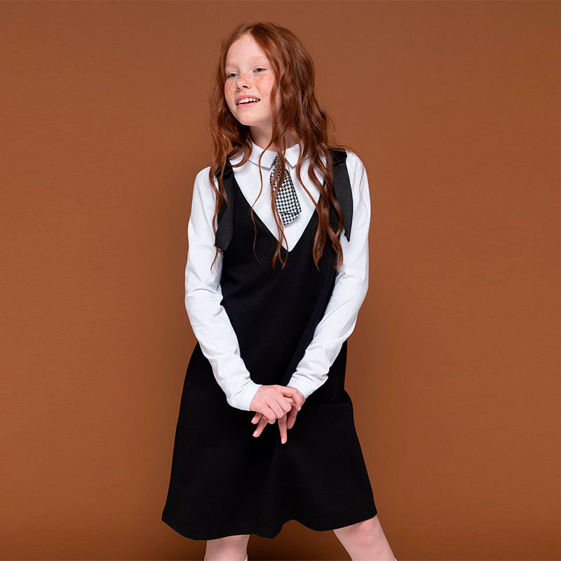 Состав: 60%вискоза 35%полиамид 5%эластанОписание: Сарафан школьный для девочки — проявление стиля и комфорта. Трикотажный материал обеспечивает свободу движений, а трапециевидный силуэт подходит для д... Показать описаниеевочек с любым типом фигуры. Свободный крой позволяет носить сарафан трикотажный с блузками оверсайз-силуэта, а глубокие V-образные вырезы на передней и задней части придают изысканности и элегантности. Широкие бретели из тесьмы добавляют стиля и удобства, а отсутствие застежки делает надевание и снятие сарафана максимально простым для вашей девочки. Сарафан детский трикотажный в стиле кэжуал идеально подходит для повседневного использования. В составе ткани черного сарафана без подклада преобладает вискоза, что делает изделие мягким и приятным на ощупь, а также хорошо пропускающим воздух, что очень важно для комфорта в течение дня. Благодаря добавлению полиамида и эластана сарафан сохраняет свою форму и прочность на протяжении многих носок. Черный цвет без принта делает этот свободный сарафан универсальным вариантом, который можно сочетать с различными блузками и джемперами. Вы можете создавать новые образы, комбинируя его с теплой водолазкой или легкой рубашкой, что делает его идеальным выбором для любого времени года. Не забывайте следовать рекомендациям по уходу за изделием: стирать при температуре не выше 30°C, без предварительного замачивания, с изнанки, и аккуратно расправить перед сушкой. При правильном уходе сарафан не потеряет внешнего вида. При выборе размера обратитесь к таблице размеров на фото, и помните, что цвет товара на экране вашего устройства может отличаться от его реального цвета.