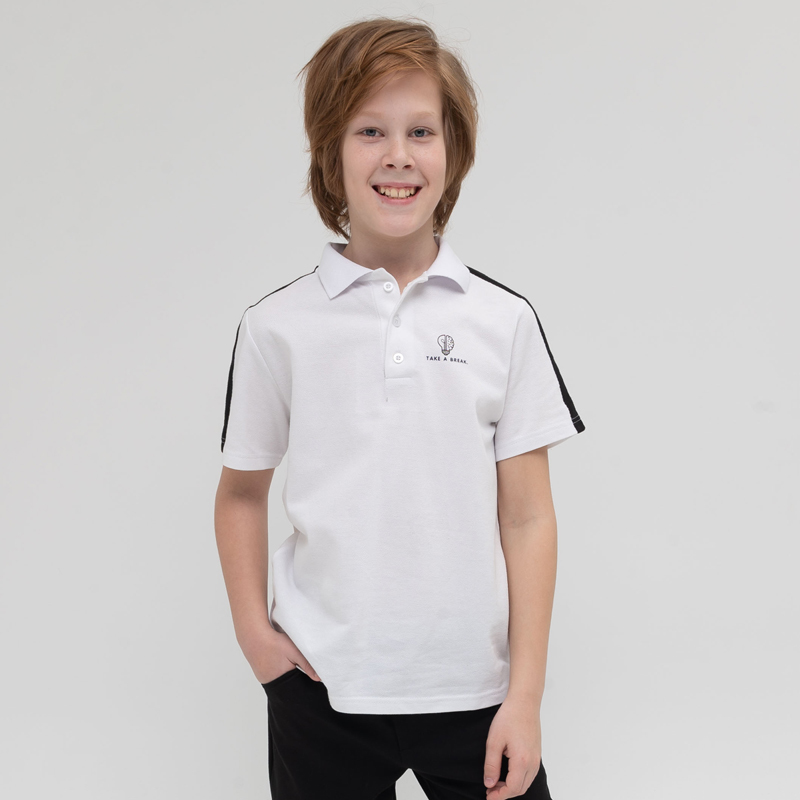 Состав: 100%хлопокОписание: Белая футболка-поло из ткани-пике для мальчика. 100% хлопок в составе – ткань плотная, мягкая, дышащая, приятная на ощупь и простая в уходе. Воротник застегивается на три п... Показать описаниеуговицы. Изюминка модели – настроченная контрастная киперная лента по линии плеч. Сбоку – лаконичный принт с призывом сделать перерыв. Футболка подходит для создания спортивного стиля, а также для школьных будней – отлично сочетается с пиджаком и брюками.