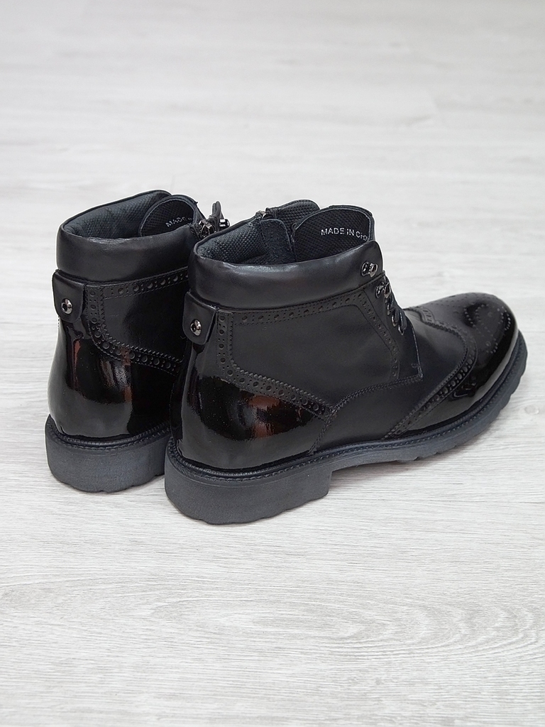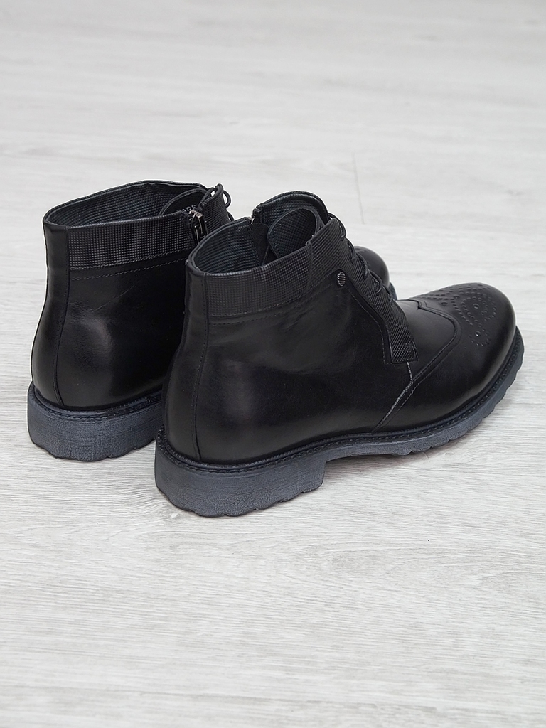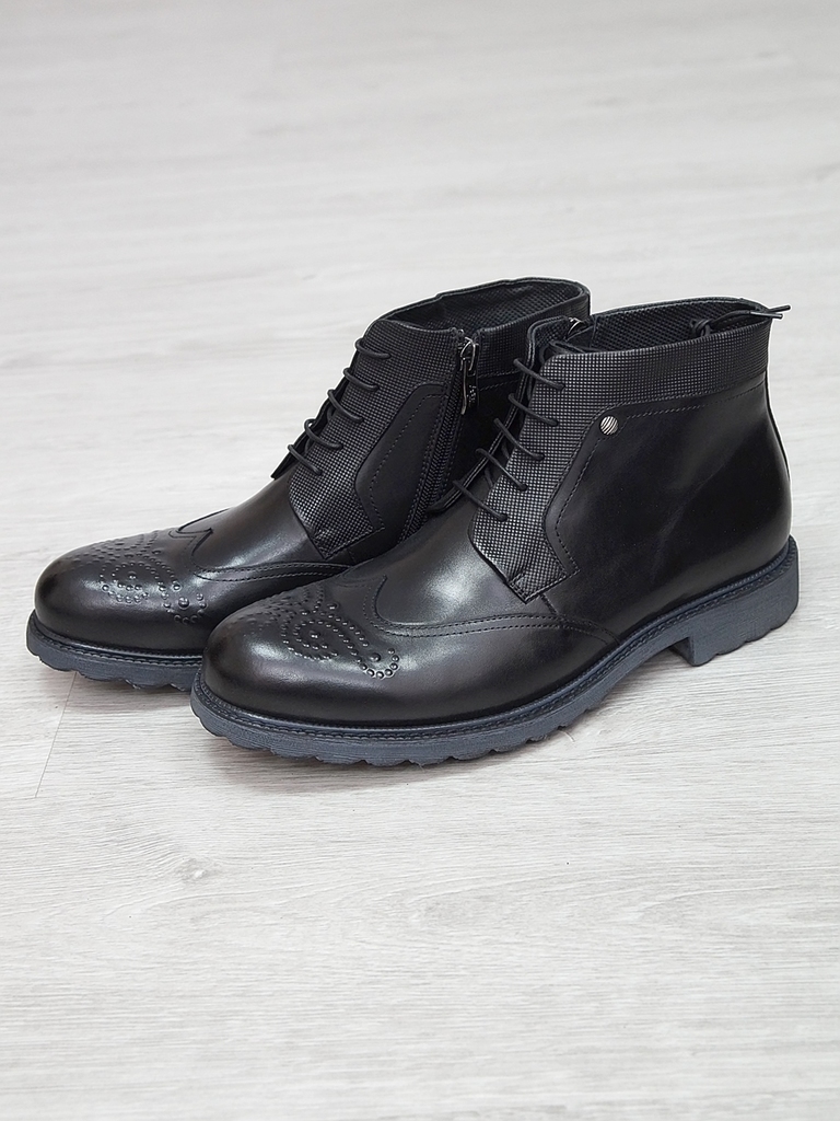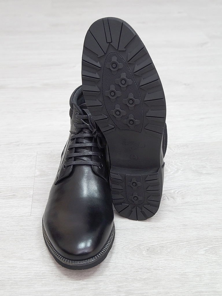 Артикул: 0212 -H9053-B1-SW3. Сезон: Демисезон. Материал верха: Натуральная кожа. Материал подкладки: Натуральная кожа. Размерность: Большемерят. Цвет: Черный. Производство: Китай. Эти демисезонные кож... Показать описаниеаные ботинки — это стильная и практичная обувь, идеально подходящая для прохладных и влажных дней. Верх выполнен из высококачественной гладкой натуральной кожи черного цвета, которая обладает отличной износостойкостью и легко выдерживает ежедневную носку. Благодаря классическому дизайну и аккуратной отделке, эти ботинки добавят элегантности и завершенности любому образу. Особенностью модели является прочная шнуровка с металлическими крючками и глазками, что обеспечивает надежную фиксацию стопы и возможность регулировки посадки по индивидуальным предпочтениям. Внутри расположена мягкая кожаная подкладка, которая создает приятное ощущение при ношении и способствует поддержанию оптимального микроклимата внутри обуви, защищая ноги от переохлаждения и натираний. Обувь оснащена прочной, рифленой резиновой подошвой с хорошим сцеплением, которая обеспечивает устойчивость на различных поверхностях и предотвращает скольжение. Высокий, устойчивый каблук и амортизирующая подошва делают ходьбу максимально комфортной, снижая нагрузку на стопу и суставы даже при длительном использовании. Эти кожаные ботинки отлично сочетаются как с классическими костюмами, так и с casual-образами, делая их универсальным вариантом для любого гардероба. Они станут надежным спутником в межсезонье, защищая ваши ноги и создавая стильный, современный образ. Подробное описание: https://obuv-tut2000.ru/magazin/product/botinki-muzhskie-demisezonnye-161