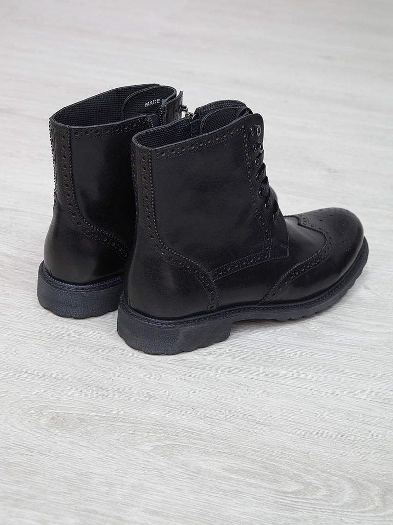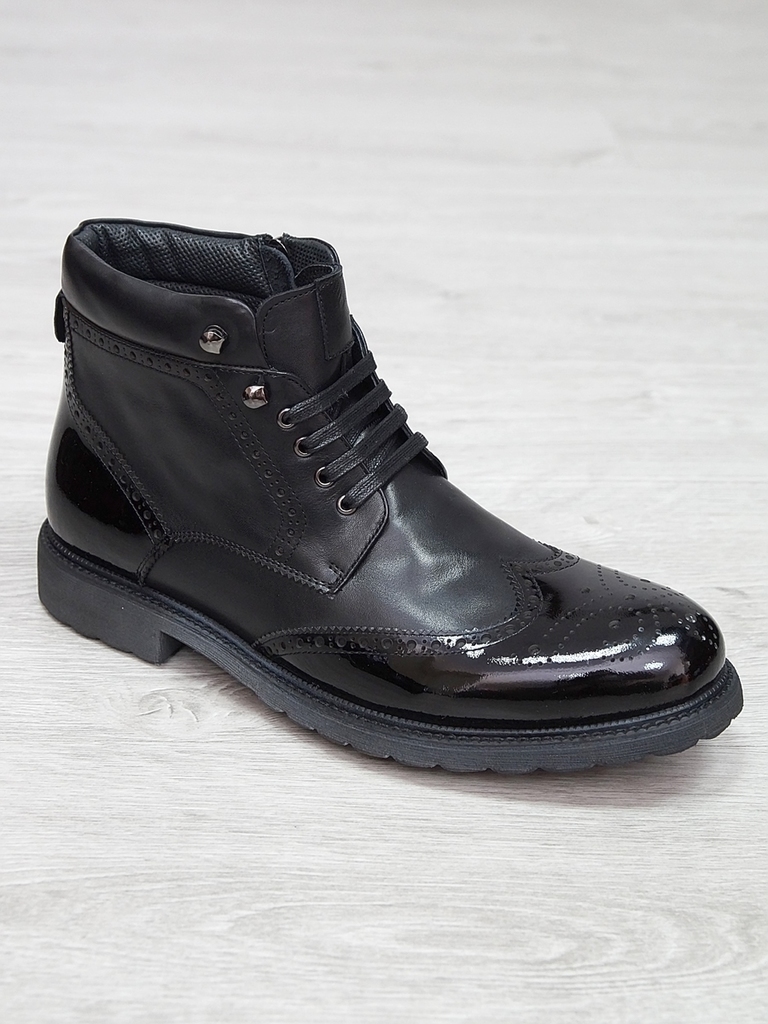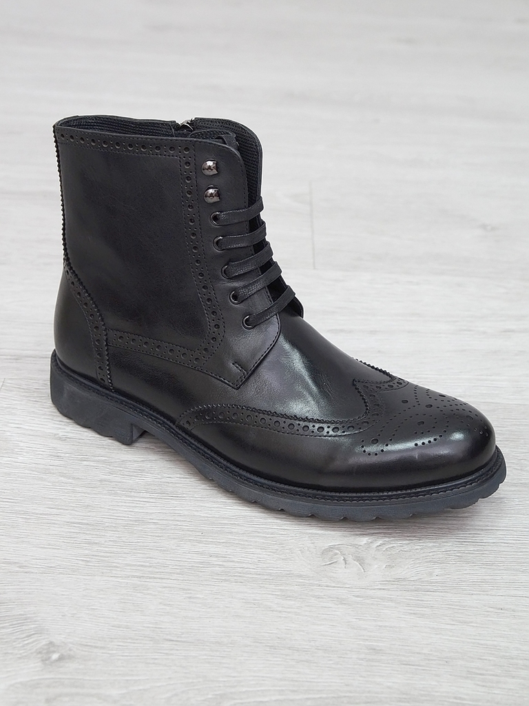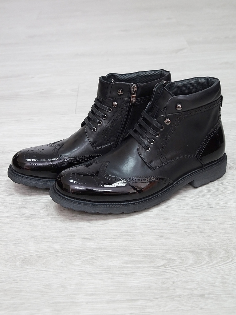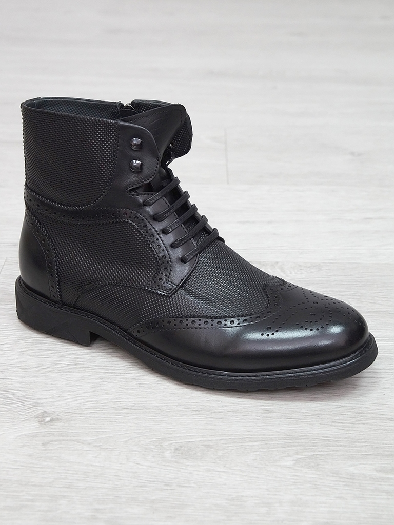 Артикул: 0212 -H9053-B1-SW3. Сезон: Демисезон. Материал верха: Натуральная кожа. Материал подкладки: Натуральная кожа. Размерность: Большемерят. Цвет: Черный. Производство: Китай. Эти демисезонные кож... Показать описаниеаные ботинки — это стильная и практичная обувь, идеально подходящая для прохладных и влажных дней. Верх выполнен из высококачественной гладкой натуральной кожи черного цвета, которая обладает отличной износостойкостью и легко выдерживает ежедневную носку. Благодаря классическому дизайну и аккуратной отделке, эти ботинки добавят элегантности и завершенности любому образу. Особенностью модели является прочная шнуровка с металлическими крючками и глазками, что обеспечивает надежную фиксацию стопы и возможность регулировки посадки по индивидуальным предпочтениям. Внутри расположена мягкая кожаная подкладка, которая создает приятное ощущение при ношении и способствует поддержанию оптимального микроклимата внутри обуви, защищая ноги от переохлаждения и натираний. Обувь оснащена прочной, рифленой резиновой подошвой с хорошим сцеплением, которая обеспечивает устойчивость на различных поверхностях и предотвращает скольжение. Высокий, устойчивый каблук и амортизирующая подошва делают ходьбу максимально комфортной, снижая нагрузку на стопу и суставы даже при длительном использовании. Эти кожаные ботинки отлично сочетаются как с классическими костюмами, так и с casual-образами, делая их универсальным вариантом для любого гардероба. Они станут надежным спутником в межсезонье, защищая ваши ноги и создавая стильный, современный образ. Подробное описание: https://obuv-tut2000.ru/magazin/product/botinki-muzhskie-demisezonnye-161