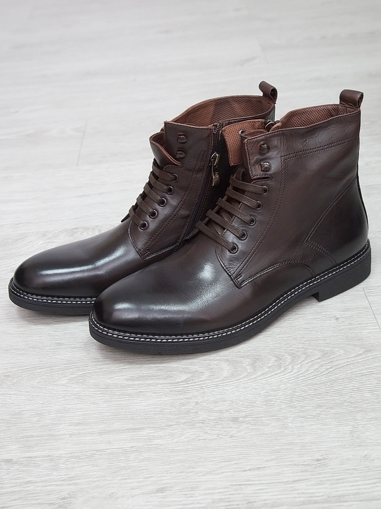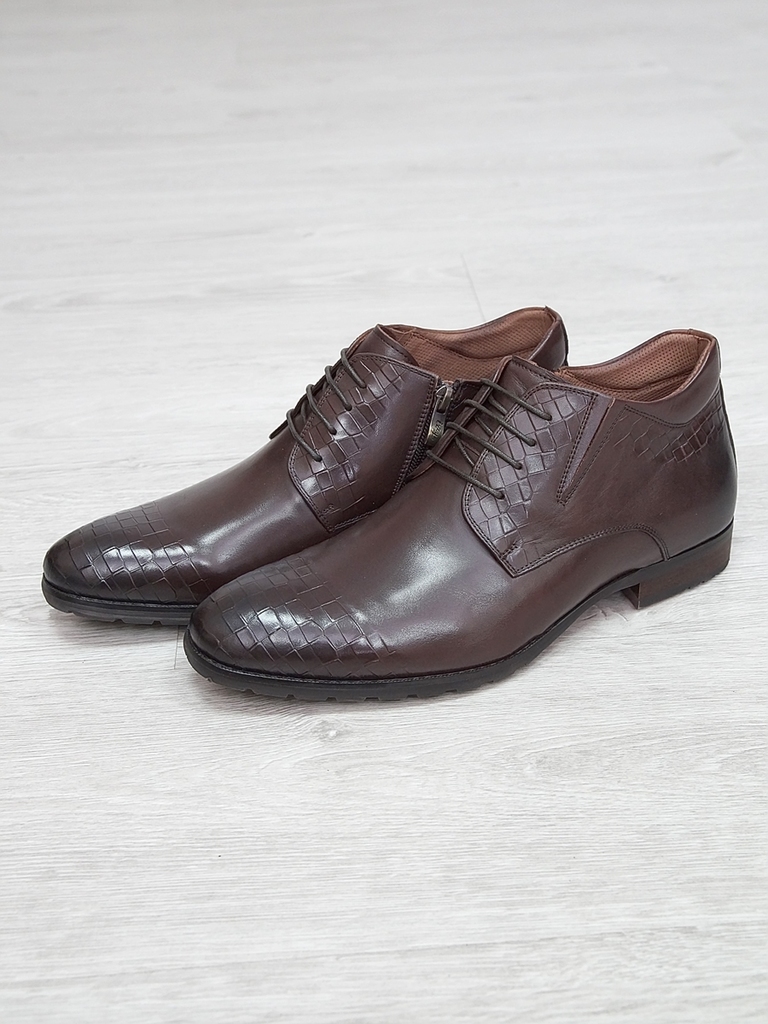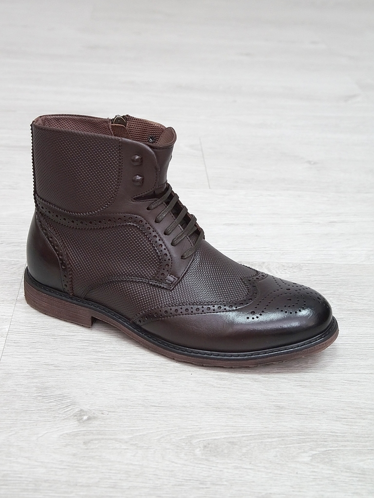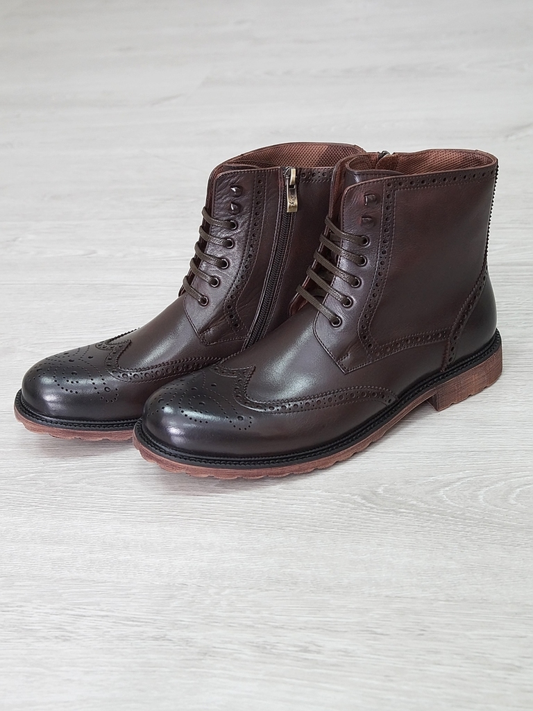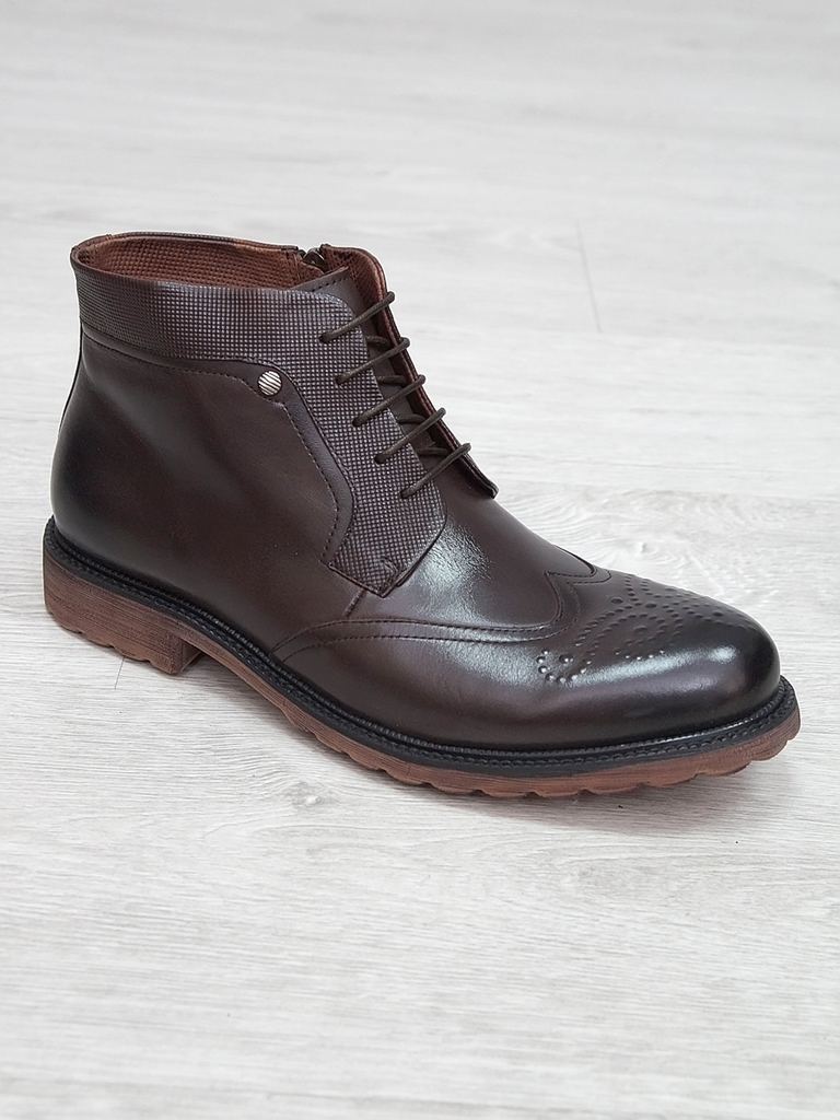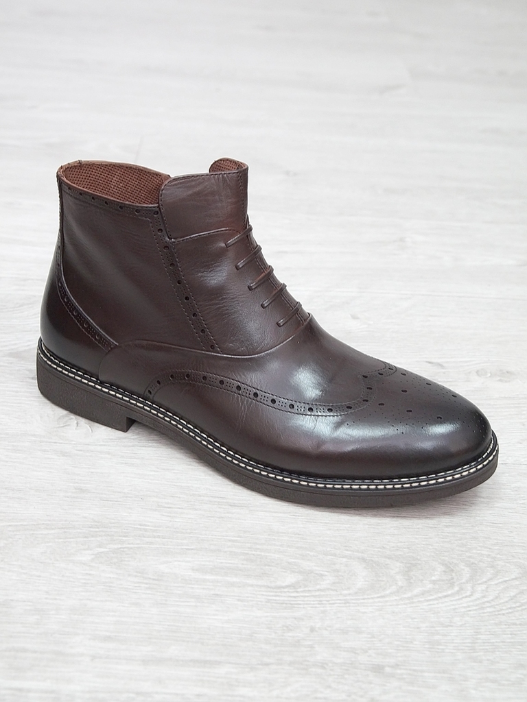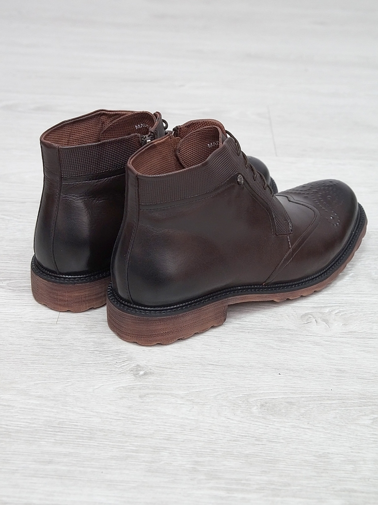 Артикул: 0214 -H9053-B1-SW5. Сезон: Демисезон. Материал верха: Натуральная кожа. Материал подкладки: Натуральная кожа. Размерность: Большемерят. Цвет: Коричневый. Производство: Китай. Эти демисезонные... Показать описание кожаные ботинки представляют собой стильную и практичную обувь, идеально подходящую для прохладной погоды и переменчивых условий межсезонья. Верх выполнен из высококачественной натуральной кожи насыщенного темно-коричневого цвета, которая отличается прочностью, износостойкостью и элегантным внешним видом. Модель обладает классической формой с аккуратным и продуманным дизайном, что делает её универсальным вариантом для разнообразных образов — от деловых до повседневных. Особенностью ботинок является прочная шнуровка с металлическими крючками и глазками, позволяющая идеально зафиксировать стопу и регулировать посадку по индивидуальным предпочтениям. Внутри расположена мягкая подкладка из натуральных материалов, которая обеспечивает комфорт при носке, способствует хорошей вентиляции и поддерживает здоровье ног в течение всего дня. Подошва выполнена из прочной резины с рельефным протектором, что обеспечивает отличное сцепление с различными поверхностями, устойчивость и безопасность при движении даже в влажную погоду. Высокий устойчивый каблук и амортизирующая подошва создают комфортную посадку и снижают нагрузку на суставы при ходьбе, позволяя дольше оставаться активным и комфортным. Эти кожаные демисезонные ботинки идеально сочетаются с классическими костюмами, джинсами и casual-образами, делая их универсальным элементом гардероба. Они не только защищают ноги в переменчивую погоду, но и подчеркивают ваш стиль и чувство вкуса, становясь надежным спутником в любой ситуации. Подробное описание: https://obuv-tut2000.ru/magazin/product/botinki-muzhskie-demisezonnye-153