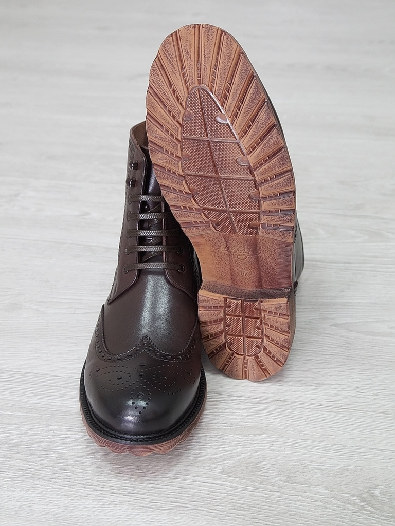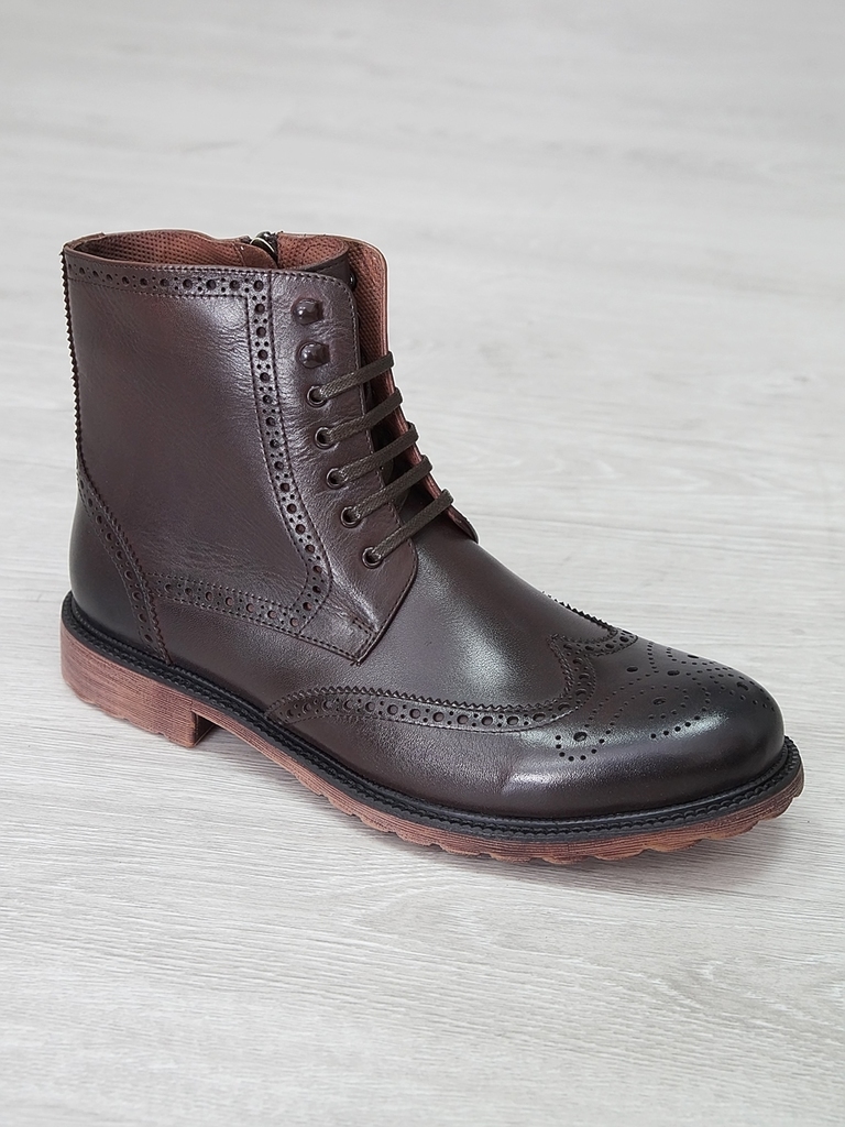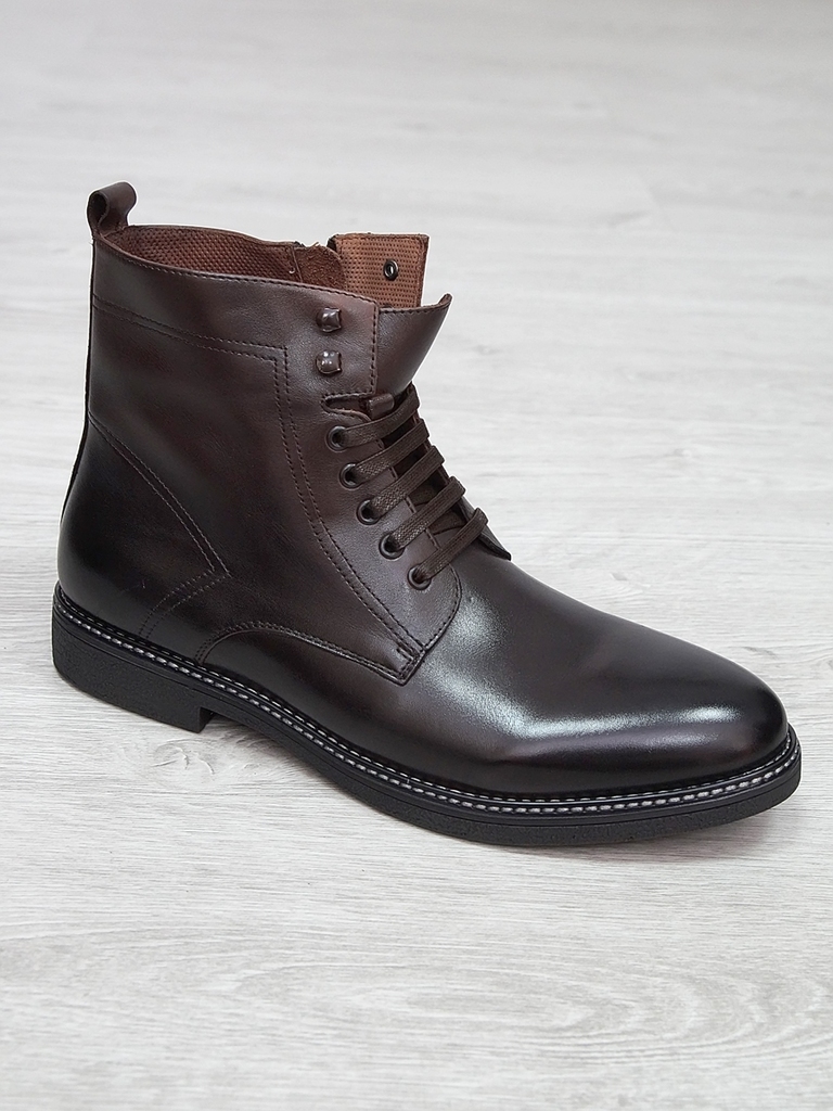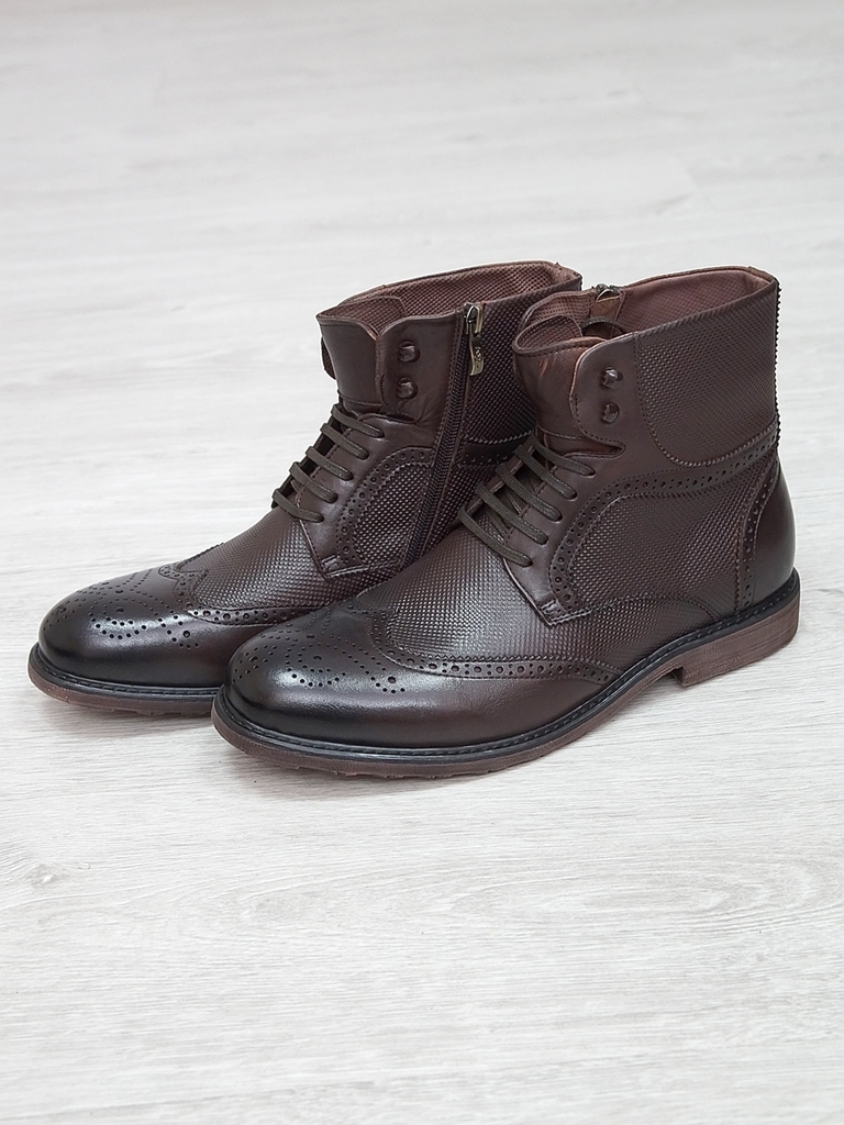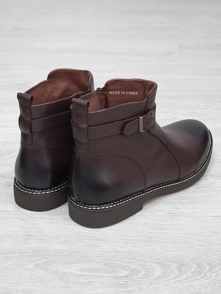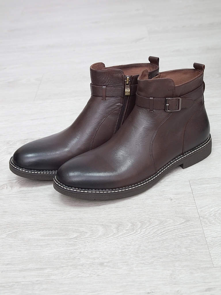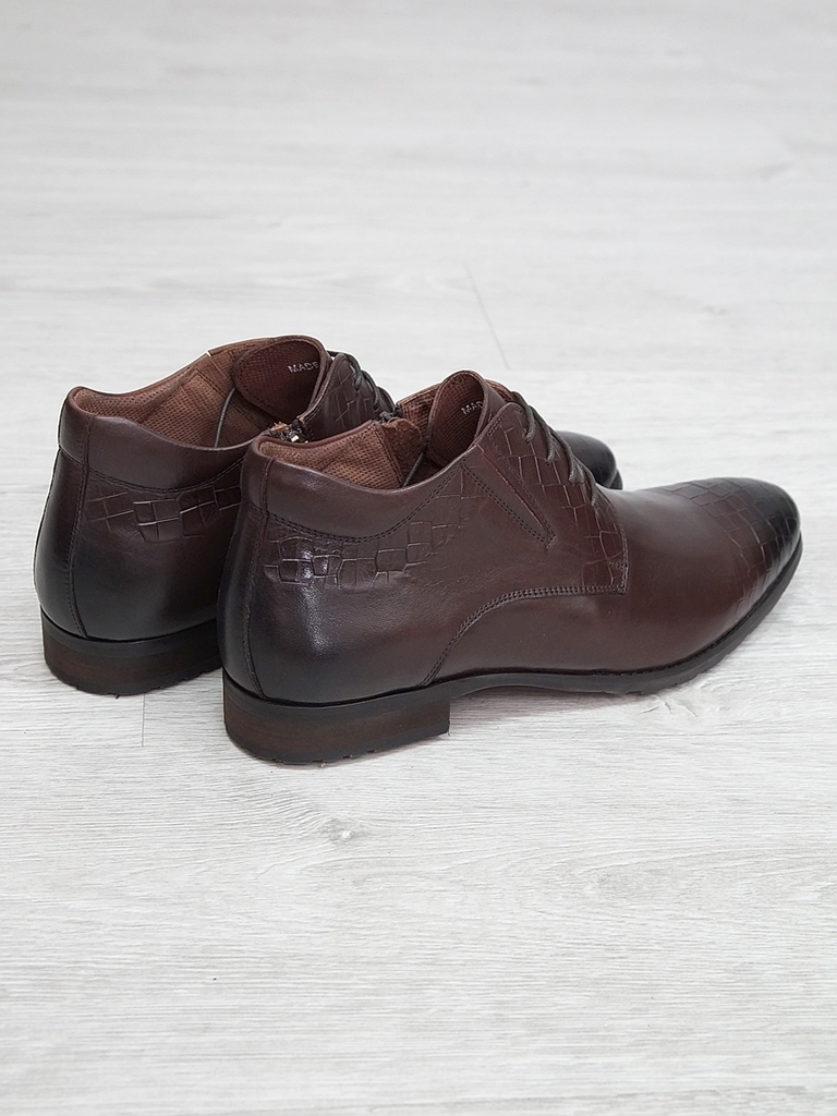 Артикул: 0214 -H9053-B1-SW5. Сезон: Демисезон. Материал верха: Натуральная кожа. Материал подкладки: Натуральная кожа. Размерность: Большемерят. Цвет: Коричневый. Производство: Китай. Эти демисезонные... Показать описание кожаные ботинки представляют собой стильную и практичную обувь, идеально подходящую для прохладной погоды и переменчивых условий межсезонья. Верх выполнен из высококачественной натуральной кожи насыщенного темно-коричневого цвета, которая отличается прочностью, износостойкостью и элегантным внешним видом. Модель обладает классической формой с аккуратным и продуманным дизайном, что делает её универсальным вариантом для разнообразных образов — от деловых до повседневных. Особенностью ботинок является прочная шнуровка с металлическими крючками и глазками, позволяющая идеально зафиксировать стопу и регулировать посадку по индивидуальным предпочтениям. Внутри расположена мягкая подкладка из натуральных материалов, которая обеспечивает комфорт при носке, способствует хорошей вентиляции и поддерживает здоровье ног в течение всего дня. Подошва выполнена из прочной резины с рельефным протектором, что обеспечивает отличное сцепление с различными поверхностями, устойчивость и безопасность при движении даже в влажную погоду. Высокий устойчивый каблук и амортизирующая подошва создают комфортную посадку и снижают нагрузку на суставы при ходьбе, позволяя дольше оставаться активным и комфортным. Эти кожаные демисезонные ботинки идеально сочетаются с классическими костюмами, джинсами и casual-образами, делая их универсальным элементом гардероба. Они не только защищают ноги в переменчивую погоду, но и подчеркивают ваш стиль и чувство вкуса, становясь надежным спутником в любой ситуации. Подробное описание: https://obuv-tut2000.ru/magazin/product/botinki-muzhskie-demisezonnye-153