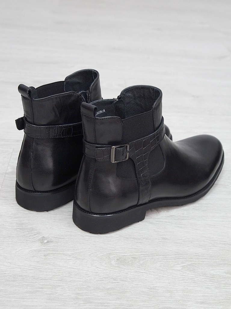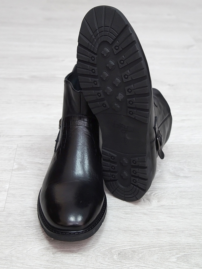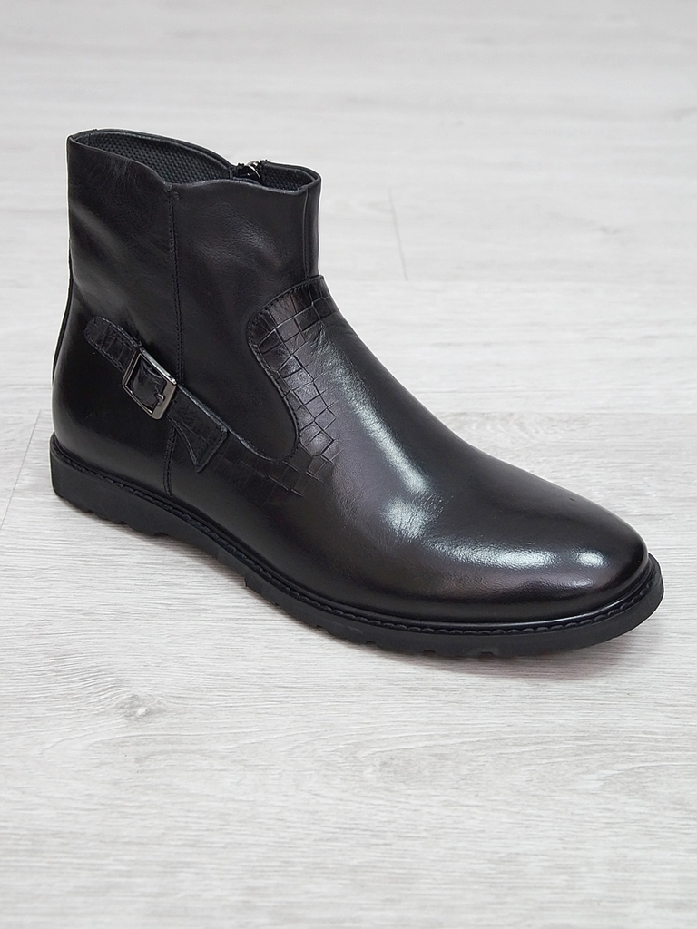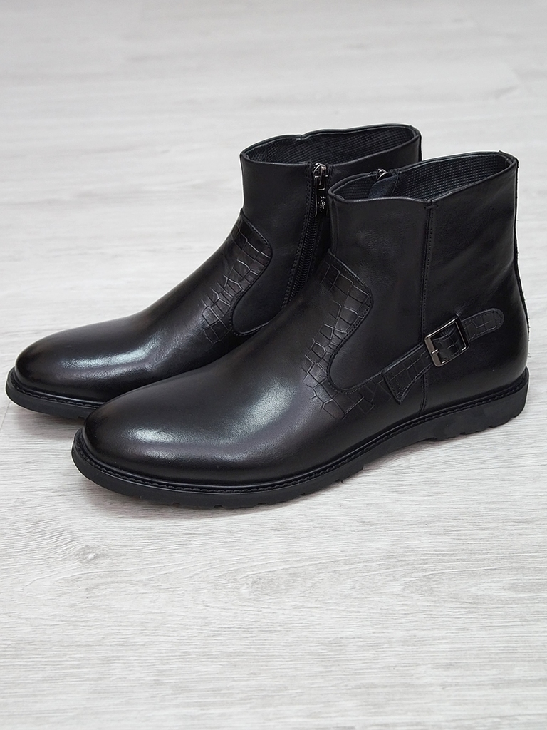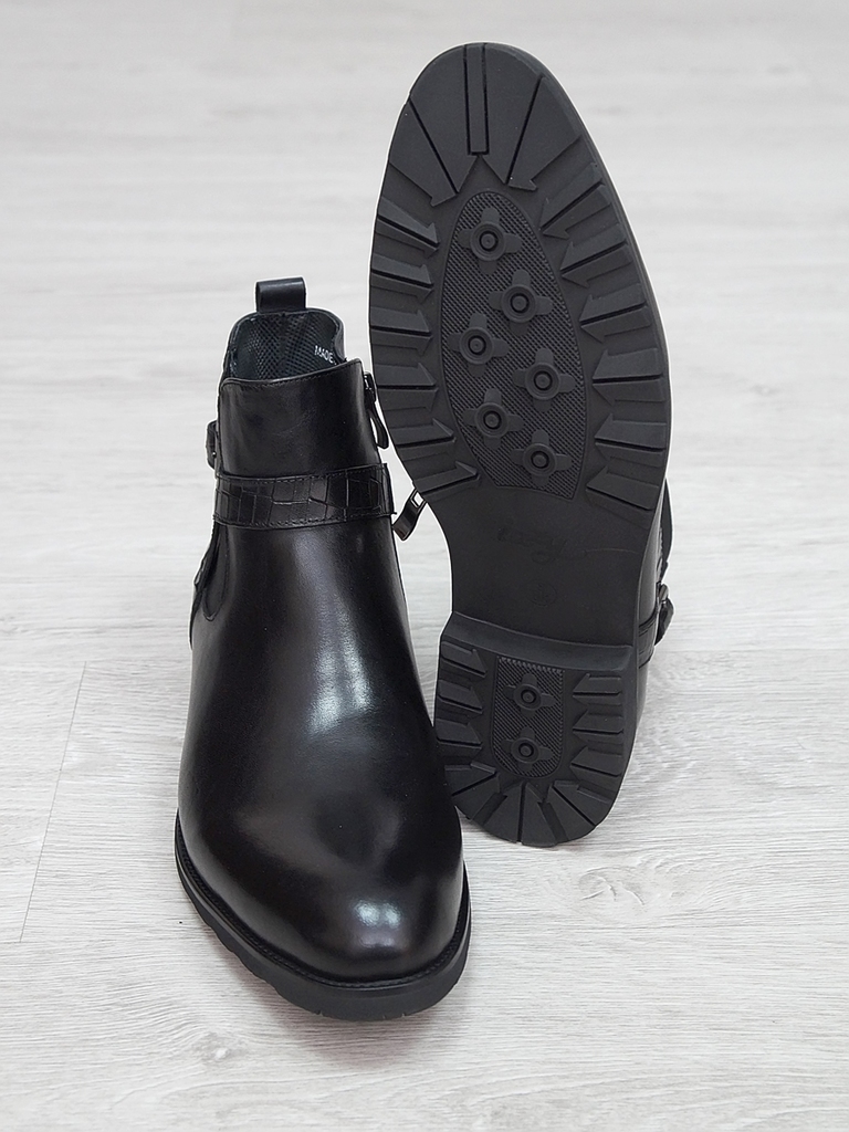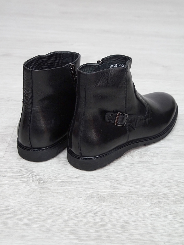 Артикул: 0236 -H9003-B82-SW3. Сезон: Демисезон. Материал верха: Натуральная кожа, Резинка. Материал подкладки: Натуральная кожа. Размерность: В размер. Цвет: Черный. Производство: Китай. Эти демисезон... Показать описаниеные кожаные ботинки представляют собой сочетание стильного дизайна, высокого качества материалов и максимального комфорта. Верх выполнен из гладкой натуральной кожи черного цвета, которая обладает отличной износостойкостью и легкостью в уходе. Модель имеет классическую форму с аккуратным, элегантным силуэтом, что позволяет сочетать их как с деловыми образами, так и с повседневной одеждой. Особенностью этих ботинок является декоративная вставка из искусственной кожи с эффектом «под кожу рептилии» на передней части, добавляющая им оригинальности и современного стиля. Внутри расположена мягкая, дышащая подкладка, которая обеспечивает комфорт и хорошую вентиляцию ног в течение всего дня. Ботинки оснащены удобной застежкой на молнии сбоку, что значительно ускоряет и облегчает процесс надевания и снятия. Регулируемый ремешок с металлической пряжкой по бокам обеспечивает надежную фиксацию стопы и позволяет подогнать обувь под индивидуальную форму ноги. Подошва выполнена из прочной, гибкой резины с рифленым протектором, обеспечивающим отличное сцепление с поверхностью и безопасное передвижение в условиях влажной или скользкой погоды. Высокий, устойчивый каблук и амортизирующая подошва создают комфорт при ходьбе и снижают нагрузку на стопу. Эти кожаные ботинки — универсальный выбор для межсезонья, они отлично сочетаются с классическими брюками, джинсами или casual-костюмами, подчеркнут ваш стиль и обеспечат надежную защиту ног в переменчивых погодных условиях. Подробное описание: https://obuv-tut2000.ru/magazin/product/polusapogi-muzhskie-izzy-0236