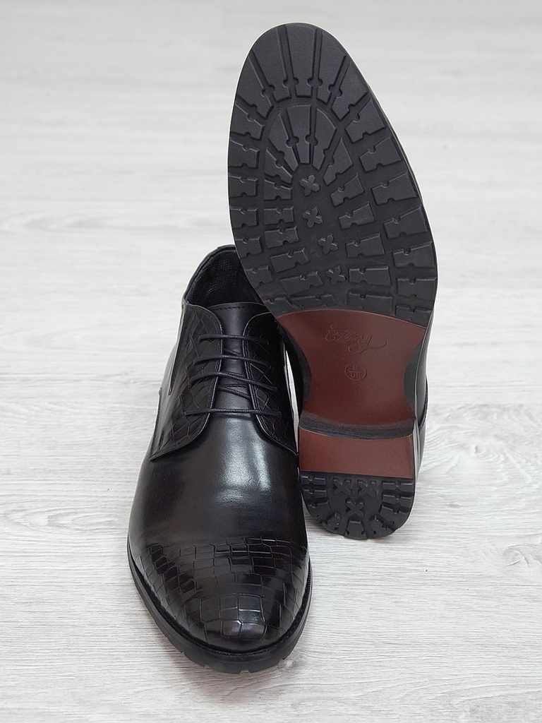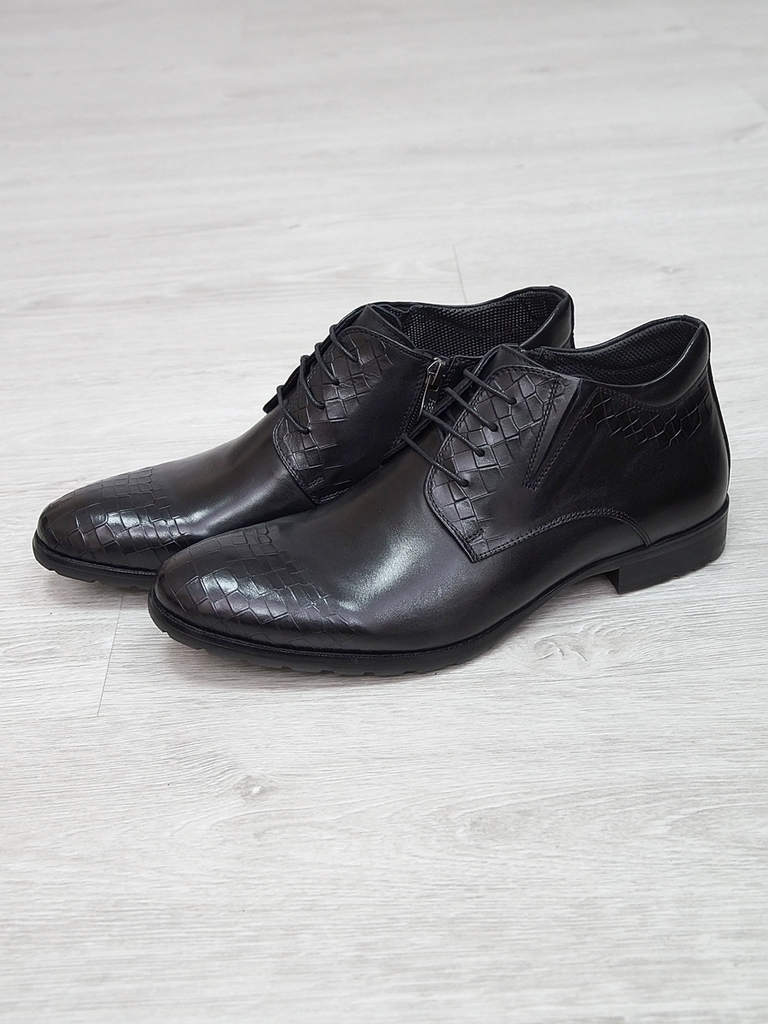 Артикул: 0233 -H9028-B36-SW3. Сезон: Демисезон. Материал верха: Натуральная кожа. Материал подкладки: Натуральная кожа. Размерность: В размер. Цвет: Черный. Производство: Китай. Эти демисезонные кожан... Показать описаниеые ботинки представляют собой сочетание стильного дизайна, высокого качества материалов и максимального комфорта. Верх выполнен из гладкой натуральной кожи черного цвета, которая обладает отличной износостойкостью и легкостью в уходе. Модель имеет классическую форму с аккуратным, элегантным силуэтом, что позволяет сочетать их как с деловыми образами, так и с повседневной одеждой. Особенностью этих ботинок является декоративная вставка из искусственной кожи с эффектом «под кожу рептилии» на передней части, добавляющая им оригинальности и современного стиля. Внутри расположена мягкая, дышащая подкладка, которая обеспечивает комфорт и хорошую вентиляцию ног в течение всего дня. Ботинки оснащены удобной застежкой на молнии сбоку, что значительно ускоряет и облегчает процесс надевания и снятия. Регулируемый ремешок с металлической пряжкой по бокам обеспечивает надежную фиксацию стопы и позволяет подогнать обувь под индивидуальную форму ноги. Подошва выполнена из прочной, гибкой резины с рифленым протектором, обеспечивающим отличное сцепление с поверхностью и безопасное передвижение в условиях влажной или скользкой погоды. Высокий, устойчивый каблук и амортизирующая подошва создают комфорт при ходьбе и снижают нагрузку на стопу. Эти кожаные ботинки — универсальный выбор для межсезонья, они отлично сочетаются с классическими брюками, джинсами или casual-костюмами, подчеркнут ваш стиль и обеспечат надежную защиту ног в переменчивых погодных условиях. Подробное описание: https://obuv-tut2000.ru/magazin/product/polusapogi-muzhskie-izzy-0233