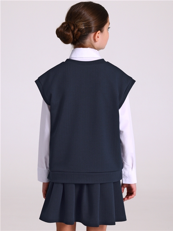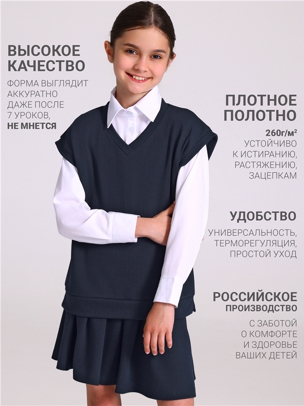 Комплект для девочки из жилета и юбки выполнен из плотного полотна с рельефным рисунком, выполненным с применением жаккардового плетения. Жилет прямого кроя с v-образным вырезом горловины, без кармано... Показать описаниев и со спущенной линией плеча. Юбка трапециевидного силуэта, длиной до середины бедра, на комфортном эластичном поясе. Отличный вариант для школы и не только! Уход: только машинная стирка (руками не стирать!) при температуре 40 градусов, без предварительного замачивания. Состав: жаккард / хлопок 55% + ПЭ 42% + лайкра 3%