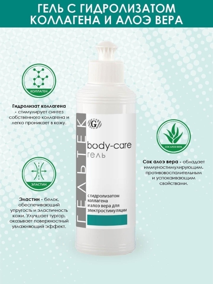 Гель с гидролизатом коллагена и алое вера для электромиостимуляции улучшает микроциркуляцию и обменные процессы не только в зоне воздействия, но и в организме в целом, поддерживает тонус мышц, уменьша... Показать описаниеет вес и объем тела, выводит шлаки из организма, повышает мышечную работоспособность, лечит целлюлит, улучшает состояние кожи(увлажняет, питает и защищает кожу), способствует выработке и поддержанию в коже коллагена. Состав: вода очищенная, гидролизат коллагена, сок Aloe Vera, глицерин, пропиленгликоль, карбомер нейтрализованный, хлорид калия, жермабен, дисодиум ЭДТА, отдушка, краситель пищевой. Показания: нарушение тургора кожи тела, стрии, целлюлит 1 и 2 стадии. Область применения: ЭМС, ультрафонофорез, микротоковая терапия, RF-терапия. Методика работы: — для электромиостимуляции при использовании стабильных электродов гель нанести по всей контактной поверхности на электроды перед их фиксацией, и провести процедуру. При использовании лабильных электродов смочить рабочую поверхность электрода гелем и выполнить процедуру, при необходимости добавляя гель для лучшего скольжения. Удалить излишки геля. Расход геля 10-20 мл на процедуру. — при микротоковой терапии при использовании металлических наконечников нанести гель на кожу, при использовании перчаток или ватных палочек смочить их гелем и выполнить процедуру (20-30 мин), при необходимости добавляя гель. Удалить излишки геля. Расход геля 10-20 мл на процедуру. — при RF-терапии гель наносить на кожу плотным слоем и работать манипулой согласно протоколу методики. В процессе процедуры удалять отработанный гель и добавлять новый. Удалить излишки геля. Расход геля 10-20 мл на область 100 см2. — при ультразвуковой терапии гель нанести тонким слоем на очищенную кожу и плотно прижимая манипулу к коже скользящими движениями выполнить процедуру (10-20 минут). При необходимости для лучшего скольжения можно добавлять гель. Удалить излишки геля. Расход геля 10-20 мл на процедуру.
