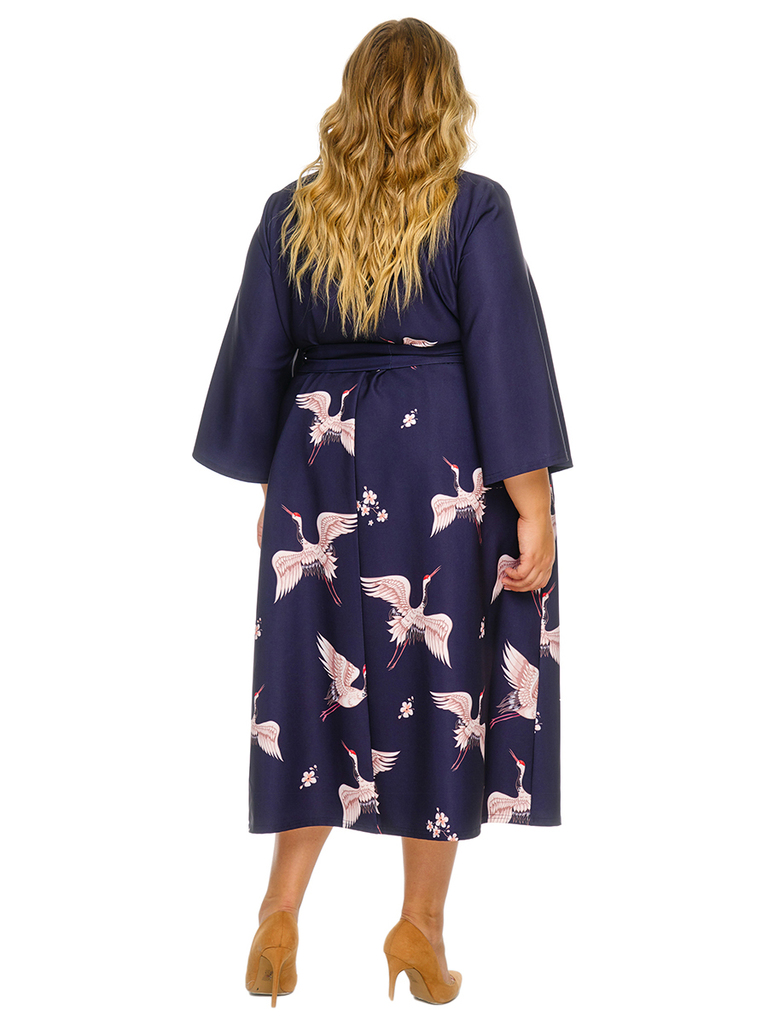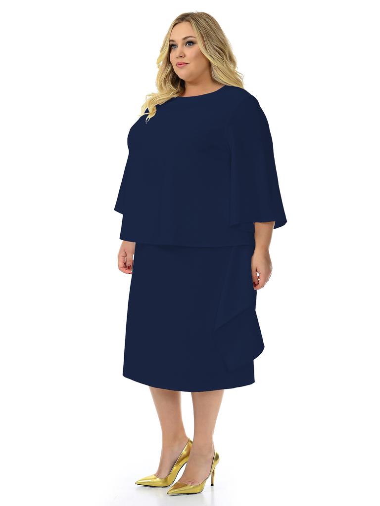 Элегантное платье с эффектом костюма. Нижняя часть(юбка) пришивается к подкладке верхней части. Вырез горловины округлый. Рукав расклешенный, В левый боковой шов юбки втачана отлетная отделочная детал... Показать описаниеь прямоугольной формы из основной ткани. Ткань – креп с эластаном, состав: 65% вискоза; 30% полиэстер; 5% эластан. Цвет - темно-синий * длина изделия по спинке 114см . Рост модели 173 см. * соответствует измерениям базовых размеров 58 - 62