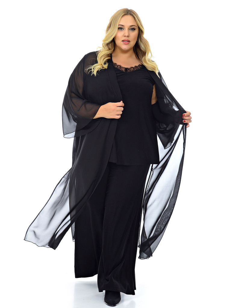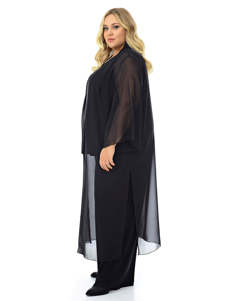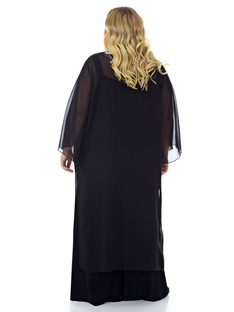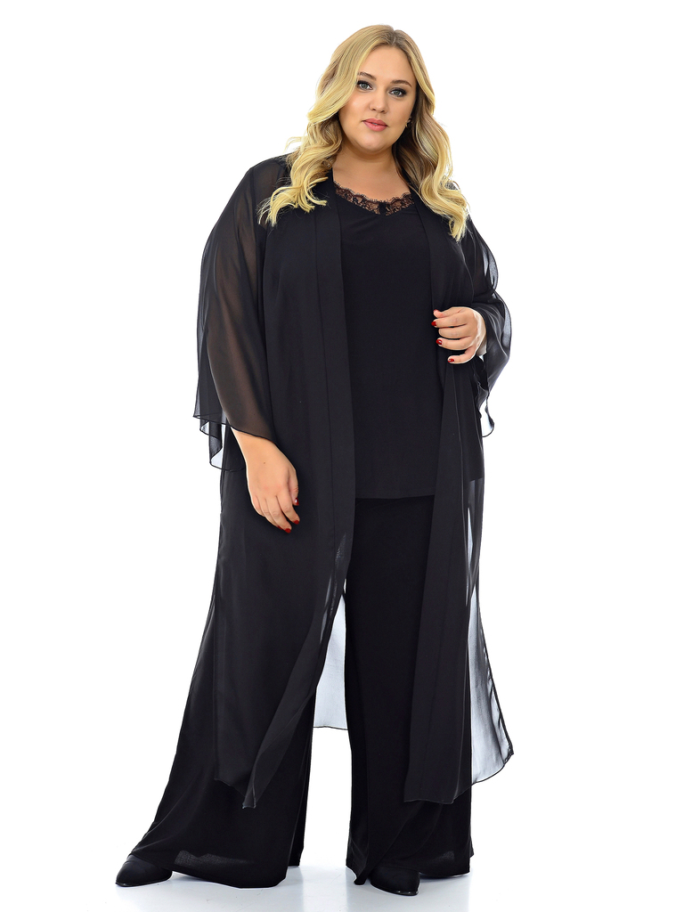 Кардиган длинный из шифона. По низу боковых швов разрезы. Рукав расклешенный. Эта модель уникальна, она способна дополнить легкостью и изяществом любой образ: будь то маленькое черное платье, струящие... Показать описаниеся брюки с топом или комплект романтичного белья. Ткань - полиэстер - 100% Цвет - черный. Длина изделия по спинке 127 см. Рост модели 173 см. * соответствует измерениям базовых размеров 58 - 62