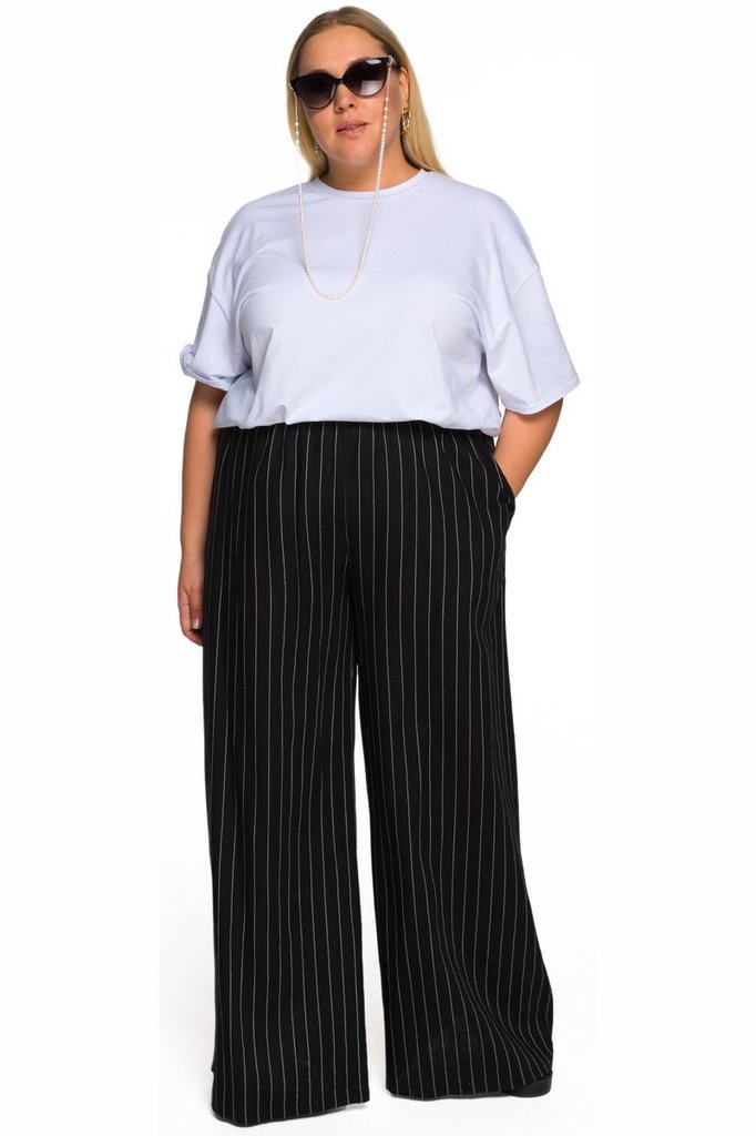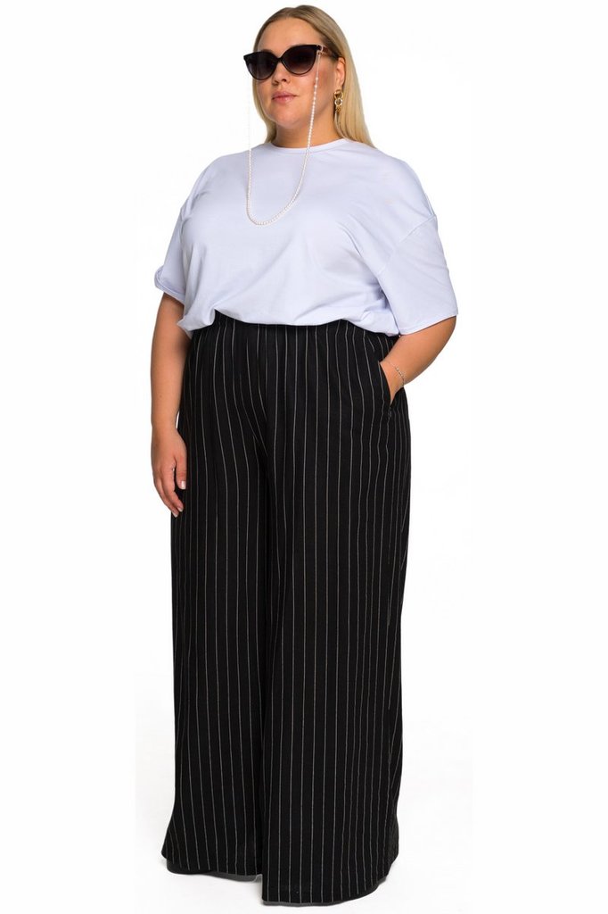 Брюки широкие из льна с карманами, черные в белую полоскуВопросы по товару