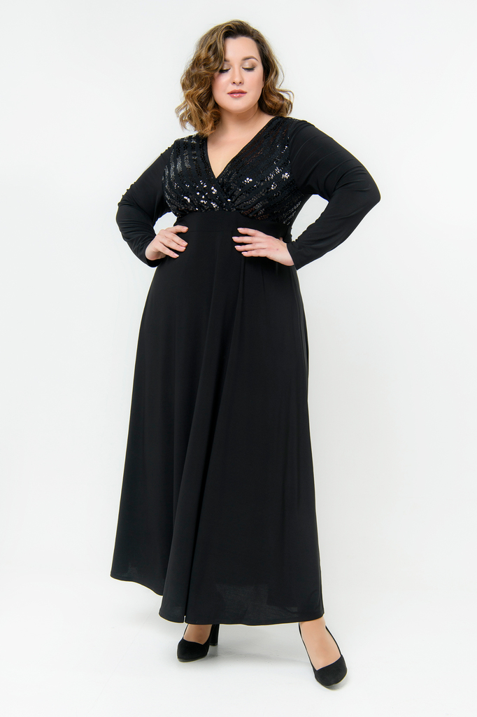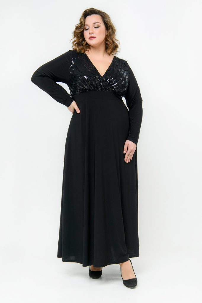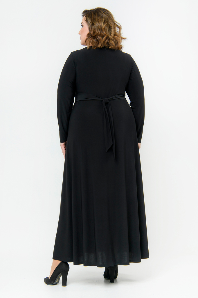 Длинное, вечернее платье из трикотажа с эластаном. Верхняя часть платья отрезная, с запАхом и V-вырезом из ткани-компаньона с блестками. Рукав длинный. Талия фиксируется поясками на спинке, втачанным... Показать описаниеи в боковые швы. Комфортное и женственное, за счет безупречного кроя и состава ткани, платье. Ткань – трикотаж- "масло", состав: 70% полиэстер; 25% вискоза, 5% эластан Цвет - черный. * длина изделия по спинке 140 см Рост модели 172 см. На модели представлен 62 размер. * соответствует измерениям базовых размеров 58 - 62