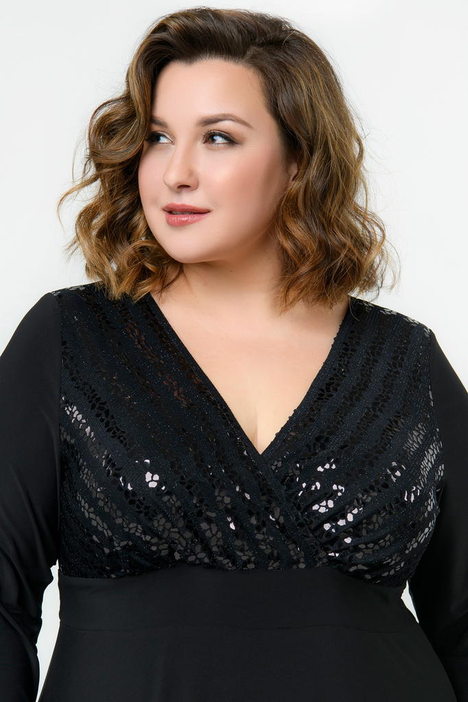 Платье вечернее, А-силуэта, свободное, из эластичной сетки, расшитой пайетками, на подкладке. V-вырез зрительно вытягивают силуэт. Рукав втачной, свободный. Платье на тонкой эластичной подкладке. Ткан... Показать описаниеь -:100% полиэстер. Подклад: 97% полиэстер; 3% эластан. Цвет черный. * длина изделия по спинке 122 см. На модели представлен 56 размер. Параметры модели: - рост 172 см - обхват груди 112 см - обхват бедер 118 см. * соответствует измерениям базовых размеров 58 - 62