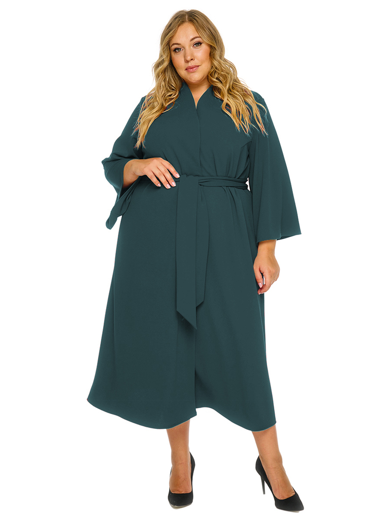 Удлиненный свободный кардиган в стиле "кимоно" из крепа с эластаном. обработкой. Скругленный край борта спереди плавно переходит в аккуратную цельнокроенную стойку на спинке, подчеркивая изящество&nb... Показать описаниеsp; линий. Рукав расклешенный. Застежка на 2 кнопки. Завязывается на пояс в тон основной ткани. Ткань - креп с эластаном, состав: 65% вискоза, 30% полиэстер, 5% эластан. Цвет - зеленый. Пояс в комплекте. * длина изделия по спинке 128 см (с учетом цельнокроенной стойки) * длина рукава 50 см * соответствует измерениям базовых размеров 58 - 62 * соответствует измерениям базовых размеров 58 - 62
