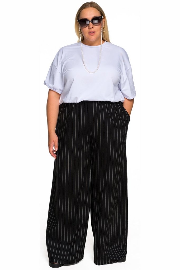 Стильный широкие брюки из льна. В боковых швах карманы. Верх на резинке шириной 3,5 см Ткань - лен, состав: 55%-лен, 45%- вискоза. Цвет - черный в белую полосочку. Длина изделия - 111 см по боковому ш... Показать описаниеву. Рост модели 173 см. * соответствует измерениям базовых размеров 58 - 62
