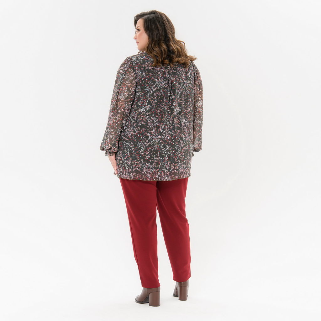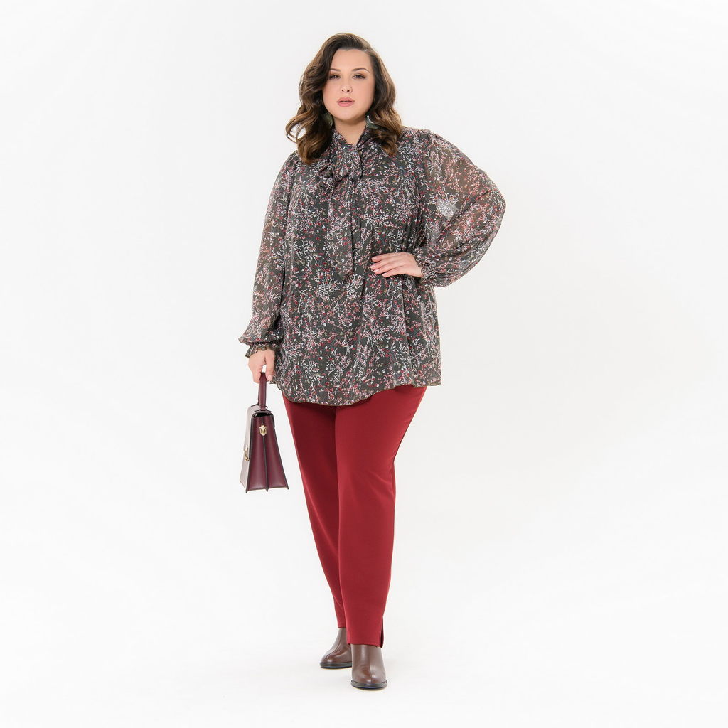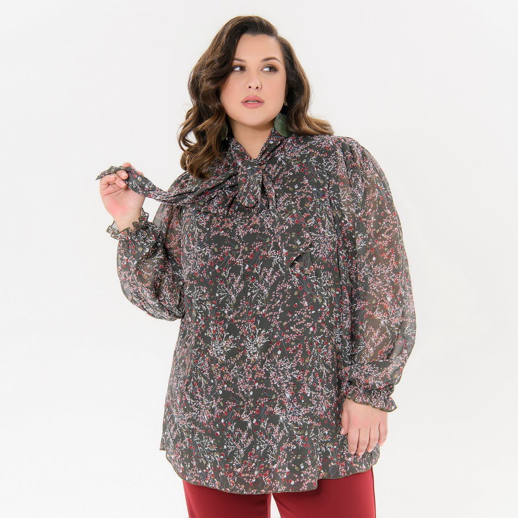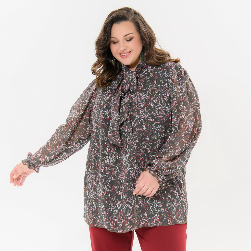 Блуза из шифона свободного силуэта. По горловине воротник - "аскот", это воротник стойка с удлиненными концами, завязывающимися на бант. Рукав свободный, легкий "фонарик", позволяющий скрыть любую пол... Показать описаниеноту рук. Низ рукава на резинке, образующей рюшь. Спинка с отрезной кокеткой и встречной складочкой. Перед и спинка блузы на тонкой эластичной подкладке. Ткань блузы: шифон, 100% полиэстер. Подклад: трикотаж, 97% полиэстер, 3% эластан. Длина по центру спинки 77 см. *соответствует измерениям базовых размеров 58 - 62 Рост модели 172 см. * соответствует измерениям базовых размеров 58 - 62