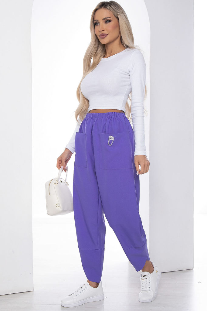 Артикул: Б9088. Ткань: костюмная ткань. Состав: 100% п/э. Цвет: сиреневый. Вид застежки: отсутствует. Силуэт: свободный. Карманы: есть. Декоративные элементы: украшение штурвал с цепочками. ... Показать описаниеДлина изделия по боковому шву: 44/ 88 см, 46/ 89 см, 48/ 90 см, 50/ 91см, 52-54/ 92 см. Рост модели: 168 см. Объёмные брюки в стиле бохо - это свободный непринужденный стиль в современной моде. Шароварный силуэт создается за счет резинки по талии, свободной посадки в бедрах, бокового защипа по низу и оригинального высокого манжета в виде тюльпана. Свободные, прямые, просторные брюки бананы выгодно подчеркивают женские формы и скрывают недостатки. Комбинируйте их с различными видами топов, джемперов, блузок или футболок. Различные аутфиты сделают вас стильной, модной для любого выхода. Такие штаны универсальны и могут быть частью городского casual образа или классического делового, повседневного школьного и даже спортивного. Брюки бананы можно носить как домашнюю одежду, они незаменимы для поездок в путешествие или командировки. Уход за изделием: ручная стирка до 30 градусов; нельзя отбеливать; деликатный отжим; гладить при t не более 110С; гладить с изнанки. *Допуск отклонения длины при массовом производстве 1-3 см является нормой.