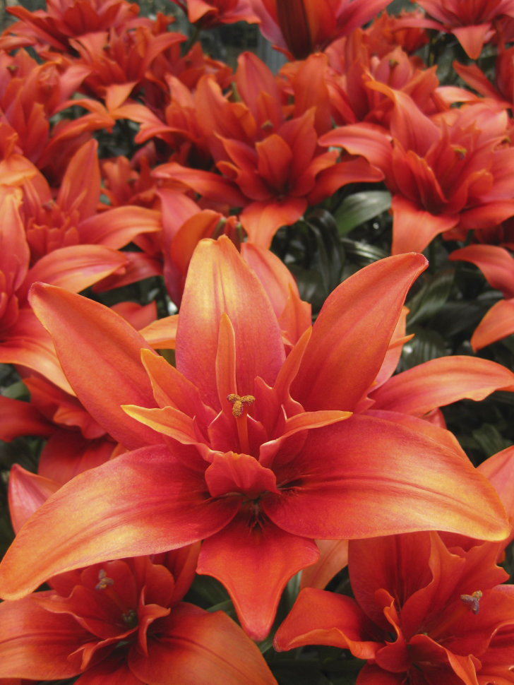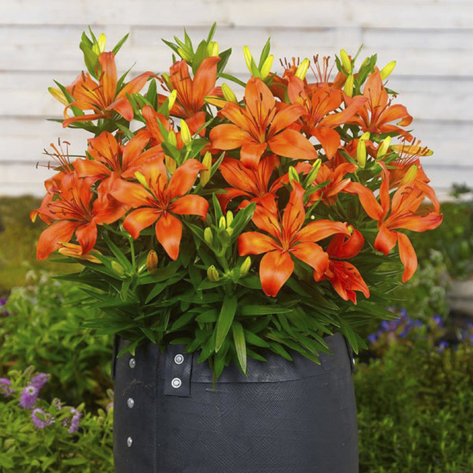 Изумительная новинка среди азиатских гибридов! Цветки махровые, насыщенного красно-оранжевого оттенка. До 12 цветков на одном стебле! Высота: 90-110 см Агротехника: Лилии выращиваются на одном месте (... Показать описаниебез пересадки) в течение 3-5 лет. Под посадку лилий выбирают места, хорошо защищенные от сильных ветров (однако хорошо проветриваемые), с солнечным местоположением или частичной полутенью. Почвы должны быть хорошо дренированные (лилии не выносят застоя воды в корнях), рыхлыми и плодородными. Перед посадкой почву обрабатывают на глубину 35-40 см, добавляют удобрения. Глубина посадки луковиц: * для низкорослых сортов (крупные луковицы) -10-12 см, с расстоянием между луковицами 15-20 см; * для среднерослых сортов (крупные луковицы) - 12-15 см, с расстоянием между луковицами 20-25 см; * для высокорослых сортов (крупные луковицы) - 15-20 см, с расстоянием между луковицами 25-30 см. Делают лунки, на дно которых насыпают песок, распределяют луковицы, присыпают корни небольшим количеством песка, и засыпают их почвой. Песок помогает уберечь луковицу от излишней влаги и инфекций, находящихся в земле. Участок с высаженными луковицами поливают. Последующий уход заключается в периодическом поливе (раз в 7-10 дней), подкормках и рыхлении почвы. В конце сезона цветоносы обрезают на уровне земли. Ежегодно осенью на участки с лилиями рекомендуется вносить хорошо перепревший компост. В районах с суровым климатом, посадки лилий укрывают лапником слоем 15-20 см. Весной, когда минует угроза заморозков, укрытие снимают.