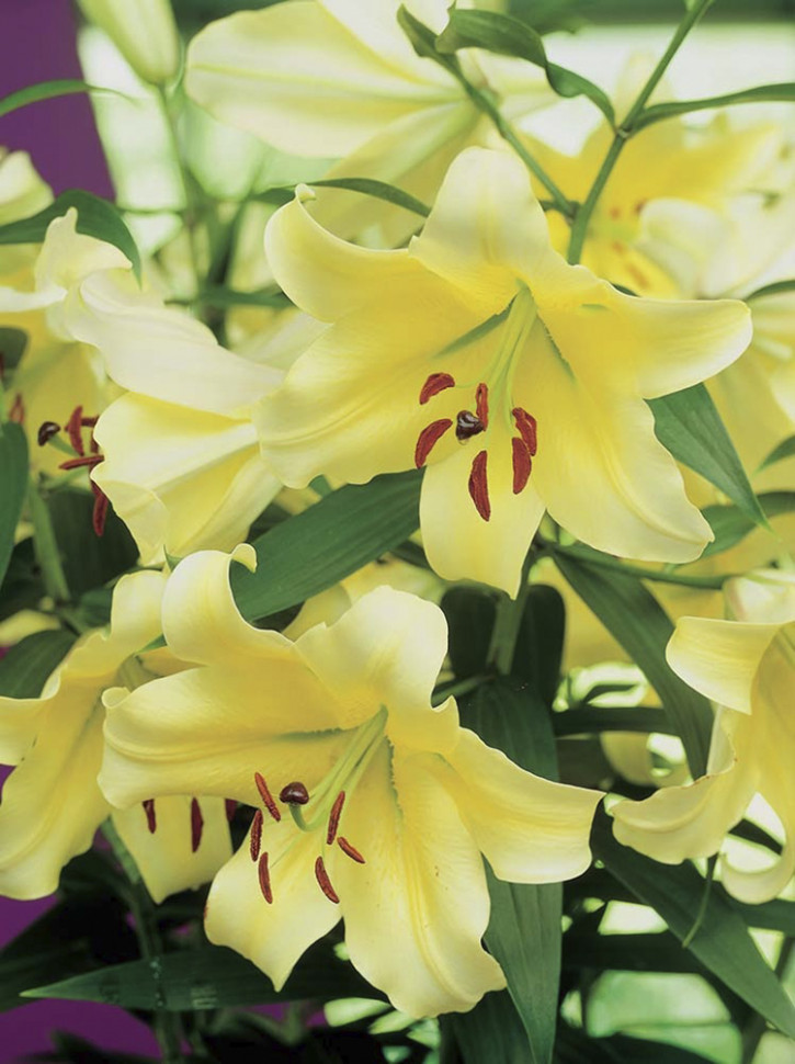 Огромные цветки в форме чашеобразной воронки смотрят в стороны и немного вниз. Лепестки нежного лимонно-желто-золотистого оттенка о с кремово-белыми кончиками изящно загибаются назад. В цен... Показать описаниетре - зеленоватые штрихи. Тычинки коричневого цвета. Высота 120-150 см. Лилия из серии "Treelilies", при благоприятных условиях на 3-4 год после посадки может достигнуть в высоту 2 м и нести на себе до 30 бутонов! Агротехника: лилии могут выращиваться на одном месте (без пересадки) в течение 3-5 лет. Под посадку лилий выбирают места, хорошо защищенные от сильных ветров (однако хорошо проветриваемые), с солнечным местоположением или частичной полутенью. Почвы должны быть хорошо дренированные (лилии не выносят застоя воды в корнях), рыхлыми и плодородными. Перед посадкой почву обрабатывают на глубину 35-40 см, добавляют удобрения. Глубина посадки луковиц: * для низкорослых сортов (крупные луковицы) -10-12 см, с расстоянием между луковицами 15-20 см; * для среднерослых сортов (крупные луковицы) - 12-15 см, с расстоянием между луковицами 20-25 см; * для высокорослых сортов (крупные луковицы) - 15-20 см, с расстоянием между луковицами 25-30 см. Делают лунки, на дно которых насыпают песок, распределяют луковицы, присыпают корни небольшим количеством песка, и засыпают их почвой. Песок помогает уберечь луковицу от излишней влаги и инфекций, находящихся в земле. Участок с высаженными луковицами поливают. Ежегодно осенью на участки с лилиями рекомендуется вносить хорошо перепревший компост. В районах с суровым климатом, посадки лилий укрывают лапником слоем 15-20 см. Весной, когда минует угроза заморозков, укрытие снимают. Последующий уход заключается в периодическом поливе (раз в 7-10 дней), подкормках и рыхлении почвы. В конце сезона цветоносы обрезают на уровне земли.