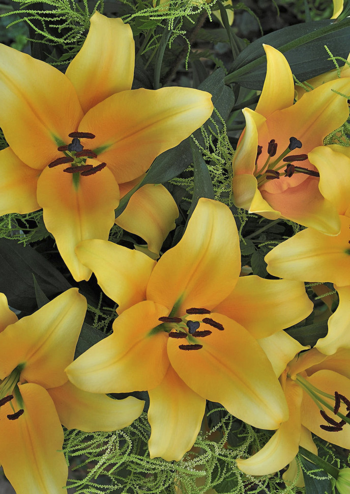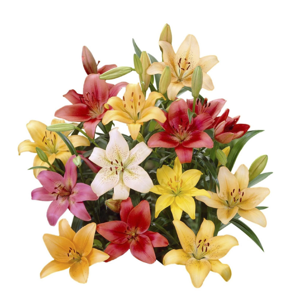 Смесь азиатских лилий пяти разных цветов. * Высота: 90-110 см * Диаметр цветка: 15 см Агротехника: Лилии выращиваются на одном месте (без пересадки) в течение 3-5 лет. Под посадку лилий выбирают места... Показать описание, хорошо защищенные от сильных ветров (однако хорошо проветриваемые), с солнечным местоположением или частичной полутенью. Почвы должны быть хорошо дренированные (лилии не выносят застоя воды в корнях), рыхлыми и плодородными. Перед посадкой почву обрабатывают на глубину 35-40 см, добавляют удобрения. Глубина посадки луковиц: * для низкорослых сортов (крупные луковицы) -10-12 см, с расстоянием между луковицами 15-20 см; * для среднерослых сортов (крупные луковицы) - 12-15 см, с расстоянием между луковицами 20-25 см; * для высокорослых сортов (крупные луковицы) - 15-20 см, с расстоянием между луковицами 25-30 см. Делают лунки, на дно которых насыпают песок, распределяют луковицы, присыпают корни небольшим количеством песка, и засыпают их почвой. Песок помогает уберечь луковицу от излишней влаги и инфекций, находящихся в земле. Участок с высаженными луковицами поливают. Последующий уход заключается в периодическом поливе (раз в 7-10 дней), подкормках и рыхлении почвы. В конце сезона цветоносы обрезают на уровне земли. Ежегодно осенью на участки с лилиями рекомендуется вносить хорошо перепревший компост. В районах с суровым климатом, посадки лилий укрывают лапником слоем 15-20 см. Весной, когда минует угроза заморозков, укрытие снимают.