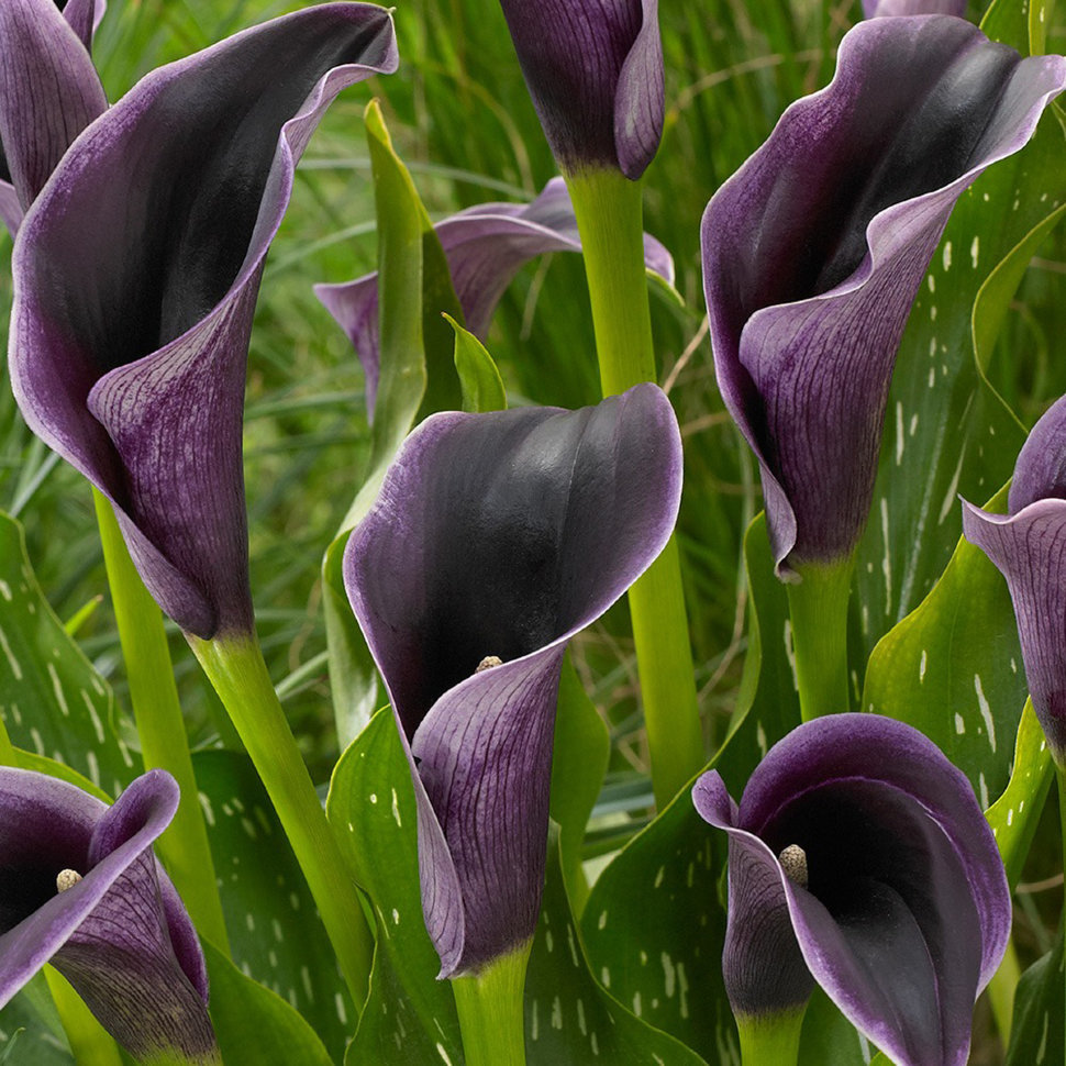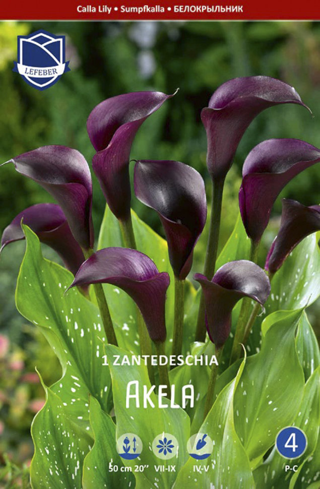 Необычайно роскошный сорт потрясающего окраса! Покрывало благородного черно-фиолетового оттенка. Листья зеленые с белым крапом. Цветение длительное, с июля до начала осени. Высота: 50-60 см Агротехник... Показать описаниеа: Каллы предпочитают яркий рассеянный свет, от прямых полуденных солнечных лучей растение притеняют. В период цветения нуждается в ярком освещении. Почва: хорошо дреннированная. Посадка: луковицы высаживаются в ряд строго горизонтально донцем вниз, а прорастающими побегами вверх в подготовленную небольшую лунку глубиной до 10 см с интервалом 15 см. Посадки обильно проливают для облегчения укоренения. Использование: калла отличается необычной экзотической красотой. Служит прекрасным украшением больших аквариумов, искусственных водоемов, фонтанов. Листья и соцветия устойчивы в срезке и широко используются при составлении букетов и композиций, придавая им необыкновенную изысканность и выразительность.