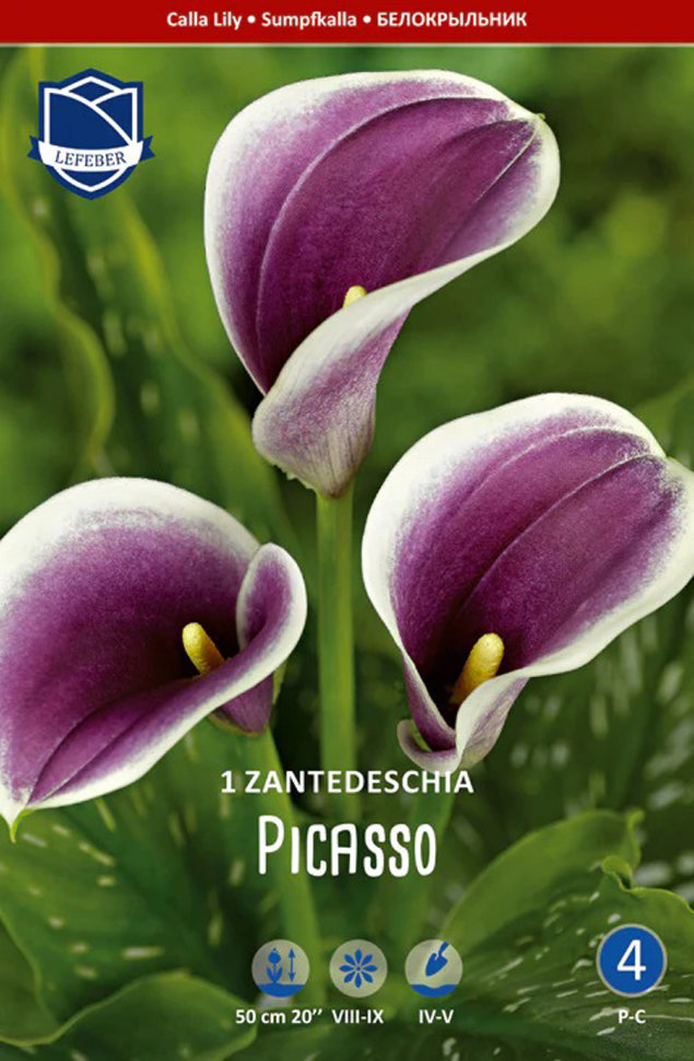 Поразительное сочетание белой окраски чаши цветка с ее темно-фиолетовой горловиной и пестрой листвой! Великолепно смотрится в контейнерах у входа в дом. Цветет с начала до середины лета. Агротехника: ... Показать описаниеКаллы предпочитают яркий рассеянный свет, от прямых полуденных солнечных лучей растение притеняют. В период цветения нуждается в ярком освещении. Почва: хорошо дреннированная. Посадка: луковицы высаживаются в ряд строго горизонтально донцем вниз, а прорастающими побегами вверх в подготовленную небольшую лунку глубиной до 10 см с интервалом 15 см. Посадки обильно проливают для облегчения укоренения. Использование: калла отличается необычной экзотической красотой. Служит прекрасным украшением больших аквариумов, искусственных водоемов, фонтанов. Листья и соцветия устойчивы в срезке и широко используются при составлении букетов и композиций, придавая им необыкновенную изысканность и выразительность.
