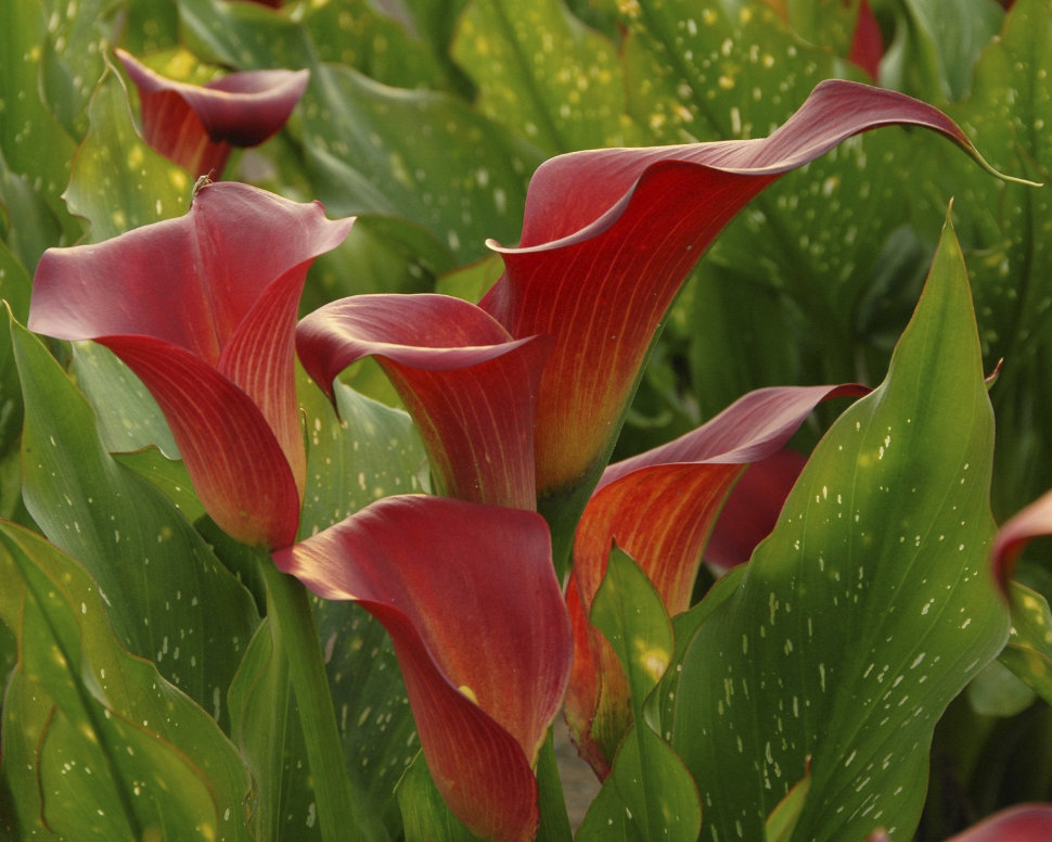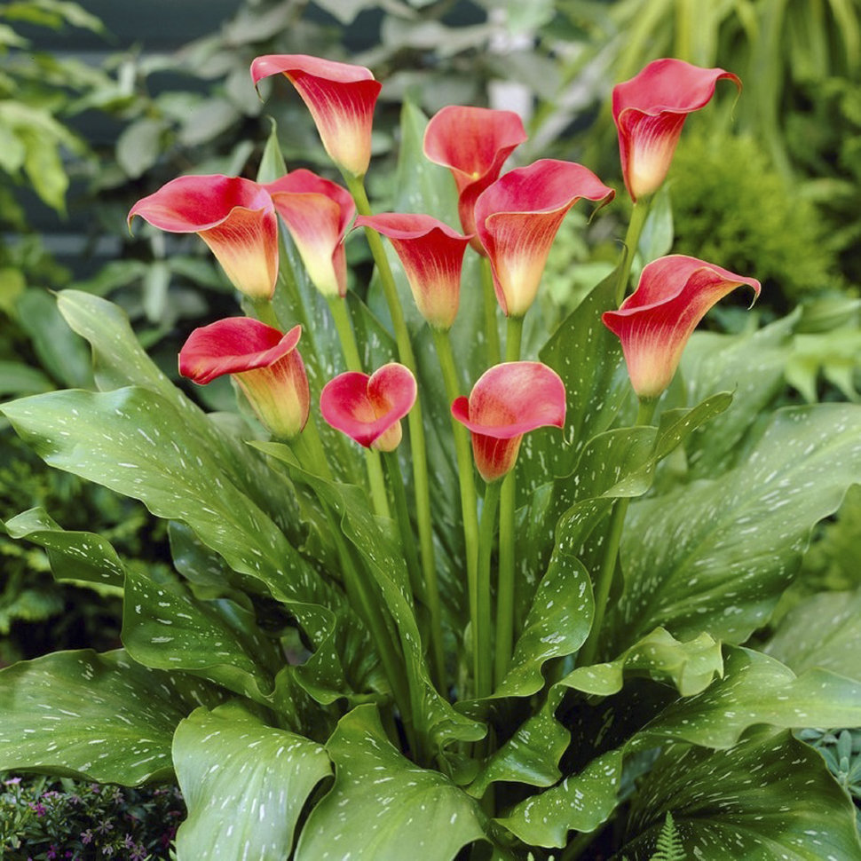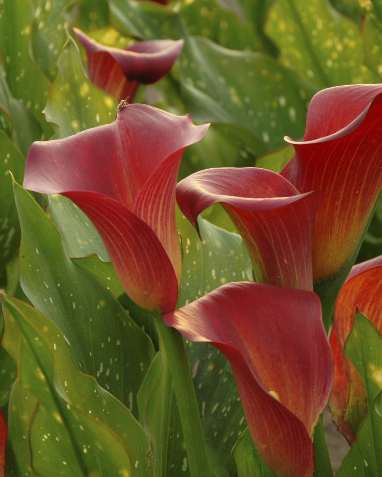 Бокалы цветков высокие, с редкой красно-оранжевой окраской. Превосходно смотрятся на фоне светло-зелёных крапчатых листьев. Агротехника: Каллы предпочитают яркий рассеянный свет, от прямых полуденных ... Показать описаниесолнечных лучей растение притеняют. В период цветения нуждается в ярком освещении. Почва: хорошо дреннированная. Посадка: луковицы высаживаются в ряд строго горизонтально донцем вниз, а прорастающими побегами вверх в подготовленную небольшую лунку глубиной до 10 см с интервалом 15 см. Посадки обильно проливают для облегчения укоренения. Использование: калла отличается необычной экзотической красотой. Служит прекрасным украшением больших аквариумов, искусственных водоемов, фонтанов. Листья и соцветия устойчивы в срезке и широко используются при составлении букетов и композиций, придавая им необыкновенную изысканность и выразительность.