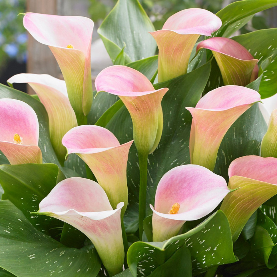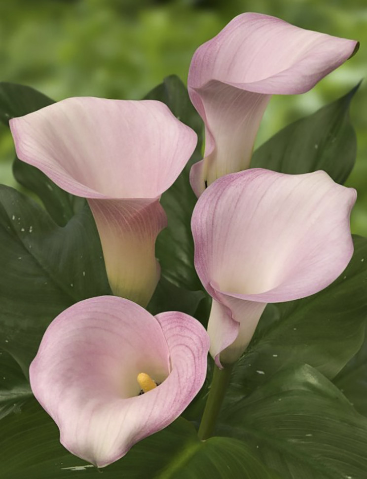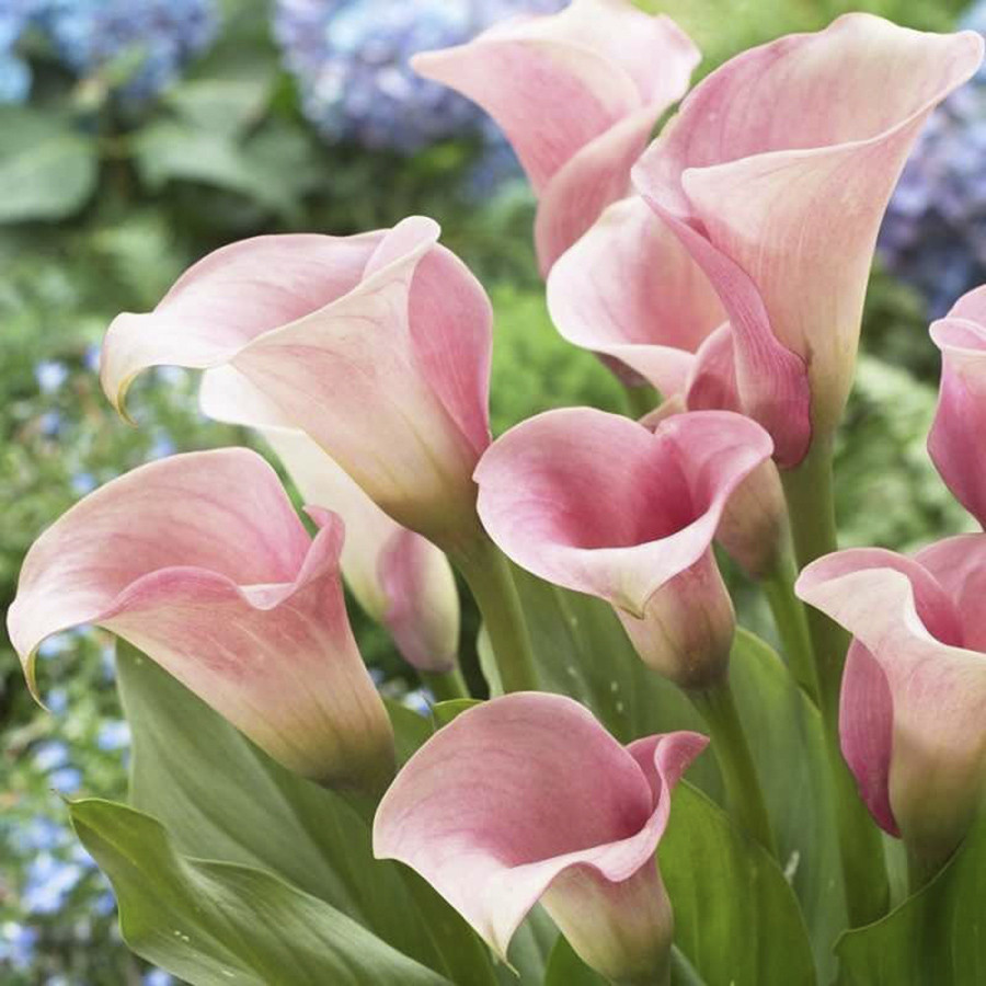 Необыкновенные воронковидные соцветия нежно-розового цвета наполнят пространство сада романтикой. Великолепно смотрится в контейнерах у входа в дом. Цветет с начала до середины лета. Агротехника: Калл... Показать описаниеы предпочитают яркий рассеянный свет, от прямых полуденных солнечных лучей растение притеняют. В период цветения нуждается в ярком освещении. Почва: хорошо дреннированная. Посадка: луковицы высаживаются в ряд строго горизонтально донцем вниз, а прорастающими побегами вверх в подготовленную небольшую лунку глубиной до 10 см с интервалом 15 см. Посадки обильно проливают для облегчения укоренения. Использование: калла отличается необычной экзотической красотой. Служит прекрасным украшением больших аквариумов, искусственных водоемов, фонтанов. Листья и соцветия устойчивы в срезке и широко используются при составлении букетов и композиций, придавая им необыкновенную изысканность и выразительность.
