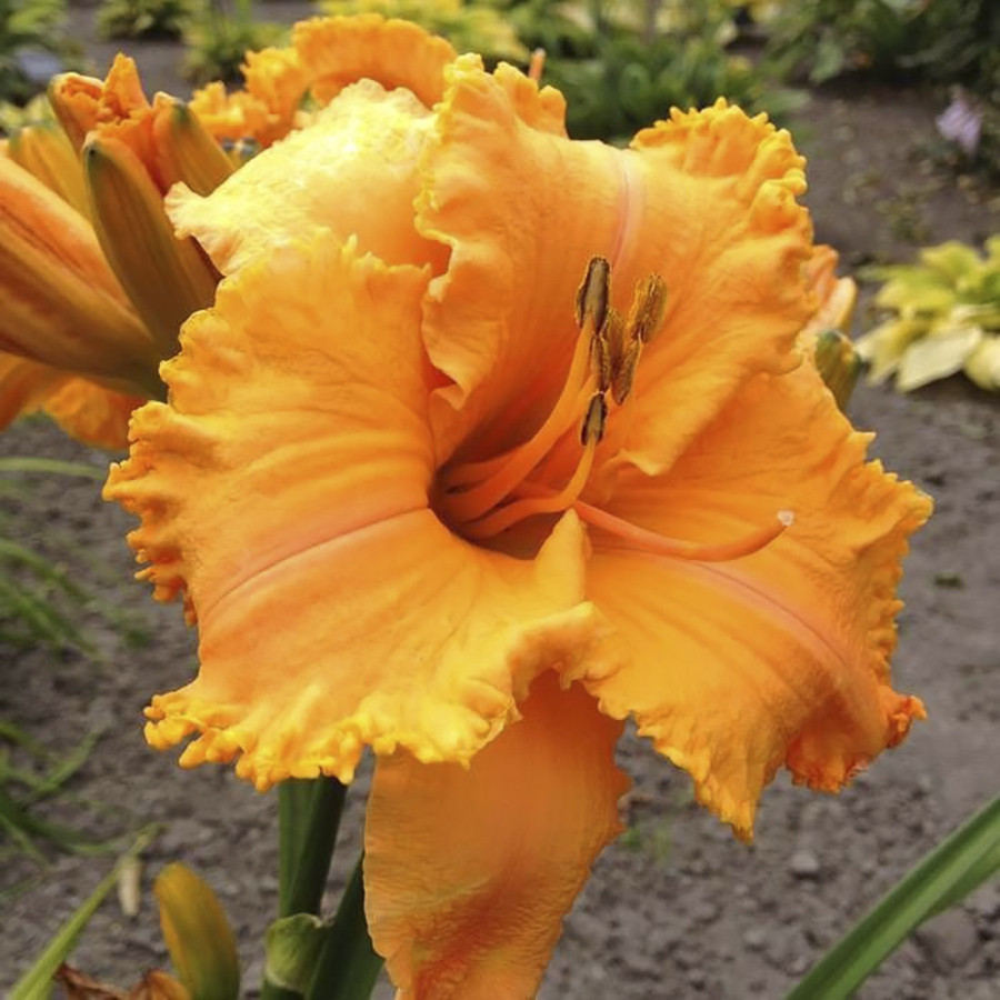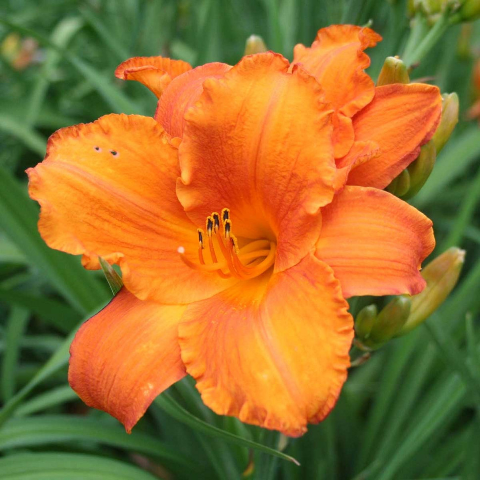 Потрясающий крупноцветковый лилейник для любителей насыщенных и ярких цветов. Это тетраплоид с цветами диаметром до 14 см, насыщенного огненно-оранжевого цвета с менее заметным, немного более глубоким... Показать описание оранжевым глазком. Цветки появляются на не очень высоких стеблях (55-60 см) с середины июля в течение 3-4 недель. Листья темно-зеленые, крепкие и здоровые. Они появляются ранней весной и сохраняются до зимы, в отличие от весенних луковиц, листья которых увядают после цветения. За исключением случайных атак слизней, у них нет никаких вредителей или болезней, от которых они могли бы пострадать. Высадите свои лилейники на солнечное место и удобряйте их для лучшего цветения каждую весну. Сорт переносит все типы почв, предпочтительно влажную. Очень вынослив - выдерживает температуры до -40 °C (зона USDA 3).