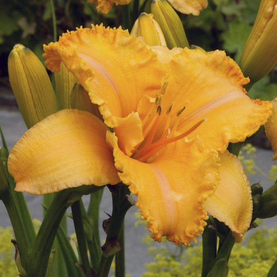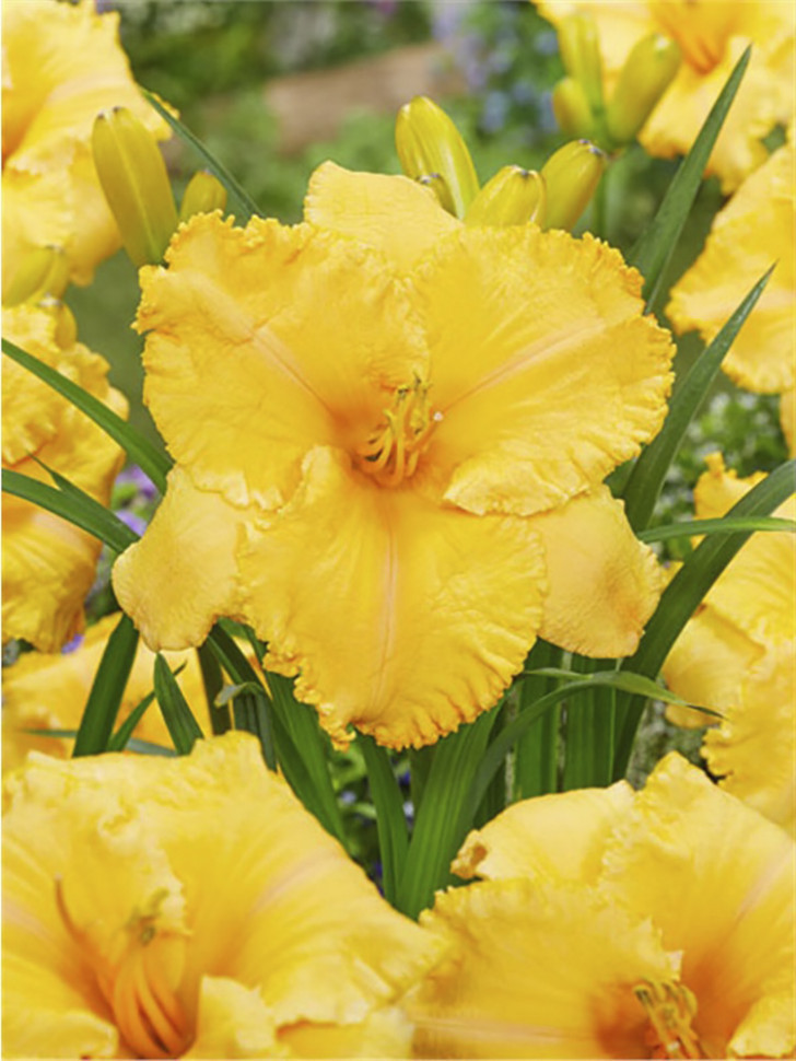 Яркий и привлекательный сорт. Повторноцветущий. Цветок у лилейника нежной золотисто-абрикосовой сокраски, практически однотонный (есть слабо выраженные розовые стрелочки), с широкими лепестками, обрам... Показать описаниелёнными зубчато-складчатой бахромой. Хорошо растущий, высокая зимостойкость. Пышные, удивительно красивые и элегантно поникающие листья в достаточно рыхлых, но удивительно широких и изящных куртинах этого растения идеально подчеркивают красоту золотистых, почти округлой формы жизнерадостных цветков с красивым краем. Диаметр цветка достигает 8-10 см, но они кажутся более крупными благодаря плотному расположению лепестков в выглядящих почти сплошными цветках. Этот лилейник хорош и в бордюрах, и в цветущих композициях. Срок цветения: средний, повторноцветущий Высота: 50 см Диаметр цветка: 8-10 см Зона зимостойкости: 3 (-40 / -34 °C)