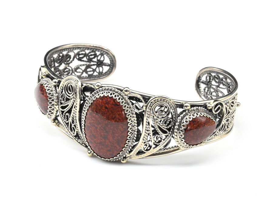 Материал: Анальцимолит Натуральность: Натуральный камень Месторождение: Россия Основание: Нейзильбер •Авторское украшение ручной работы. Камни установлены в оправу из ювелирного сплава - нейзильбер. •... Показать описаниеФорма и рисунок камня никогда не повторяются, что делает данное изделие единственным в своем роде. •Размер центрального камня 15*22мм. •Длина браслета регулируется.