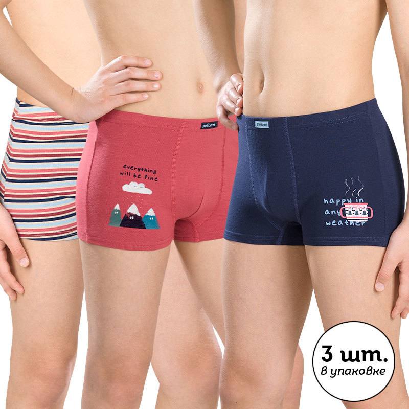 Состав: низ: 93%хлопок 7%эластан, низ2: 93%хлопок 7%эластан, низ:3 93%хлопок 7%эластанОписание: Pelican - производитель нижнего белья, представляет набор трусов для мальчика, выполненные из натурально... Показать описаниего хлопка (93%) с добавлением эластана (7%) — почти без синтетики, что особенно важно для здоровья и комфорта ребенка. Если вы ищете качественное нижнее белье для вашего сына или внука, то этот набор трусов точно понравится вам и вашему малышу. Боксеры для мальчика - это набор подростковых трусов из 3-х штук, выполнены из ткани с высоким содержанием хлопка. Хлопковые трусики отлично пропускают воздух, а эластан в составе обеспечивает эластичность и долговечность. Качественная ткань и анатомически правильный крой гарантируют комфортную посадку нижнего белья на теле, а мягкая широкая резинка в поясе не давит и не перекручивается. Трусы-шортики сохраняют отличную форму в течение долгого времени, даже после многочисленных стирок. В комплект входят облегающие детские семейники, в трех вариантах расцветки: в горизонтальную разноцветную полоску, темно-синие и красные с прикольным принтом и надписью (перевод: «Счастлив в любую погоду. Все будет хорошо»). Молодежные труселя для парней полосатые и с рисунком выполнены в спортивном стиле, в виде обтягивающих шорт. Такие транки для подростка предназначены для повседневного ношения, как нательное белье под одежду в школу или детский сад. Трусишки имеют комфортную классическую посадку, поэтому в них очень удобно заниматься спортом и физкультурой, бегом и каратэ, баскетболом и футболом. Хипстеры из коттона подойдут как для малыша, так и на мальчика подростка. Нижнее белье с анатомическим разделением из тонкого хлопка и плоскими швами позволит Вашему ребенку чувствовать себя максимально комфортно в течение всего дня в любое время года будь то лето или осень, зима или весна. Удлиненные плавки облегающие предназначены для детей в возрасте 1 и 2, 3 и 4, 5 и 6 лет. Эту модель трикотажных бельевых трусов рекомендовано стирать при температуре не выше 30 °C, без предварительного замачивания, с изнанки.