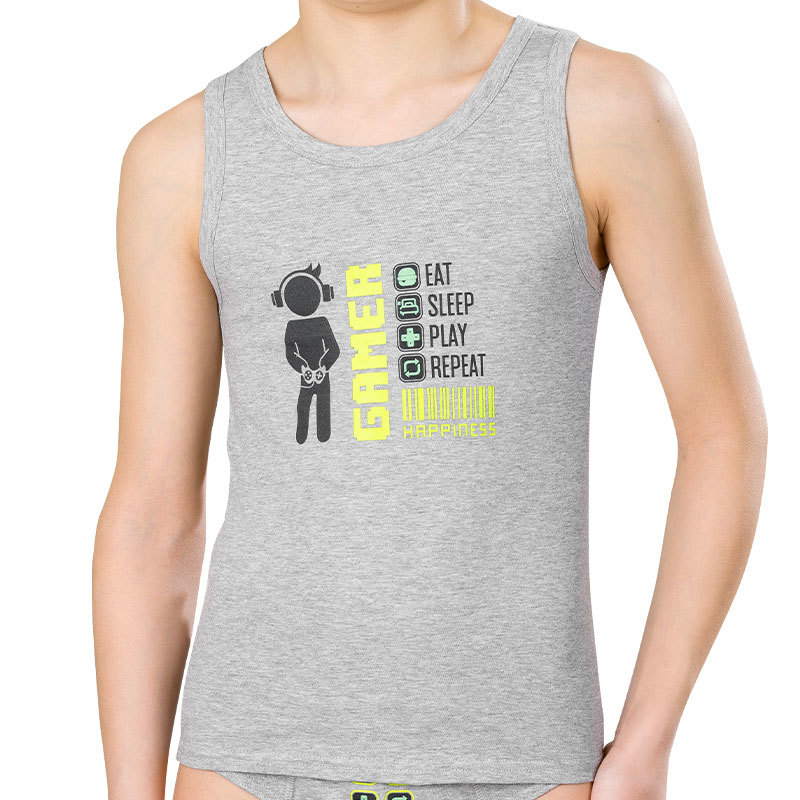 Состав: 100%хлопокОписание: Если вы в поисках качественного, комфортного и стильного белья для своего ребёнка, обратите внимание на нашу майку из 100% хлопка для мальчика. Натуральный состав ткани обе... Показать описаниеспечивает изделию мягкость и воздухопроницаемость — кожа ребёнка дышит. Модель комфортно сидит по фигуре, её можно надевать под рубашку, джемпер, свитер. Горловина и проймы изделия обработаны в тон изделия — они хорошо держат форму, мягкие, надолго сохраняют аккуратный внешний вид. Майка представлена в актуальном оттенке "серый меланж". Практичный и универсальный, он великолепно сочетается с любой одеждой. Модель украшает забавный принт геймерской тематики — понравится любому мальчишке! Перевод: "есть, спать, играть, повторять. Счастье". Принт эластичный и прочный — отлично переносит частые стирки. Такая майка идеальна для повседневной носки, а также для отдыха. Станет замечательным подарком, который способен вызвать искреннюю радость у каждого ребёнка, оставив незабываемые воспоминания о любом празднике и принося массу удовольствия каждый день.