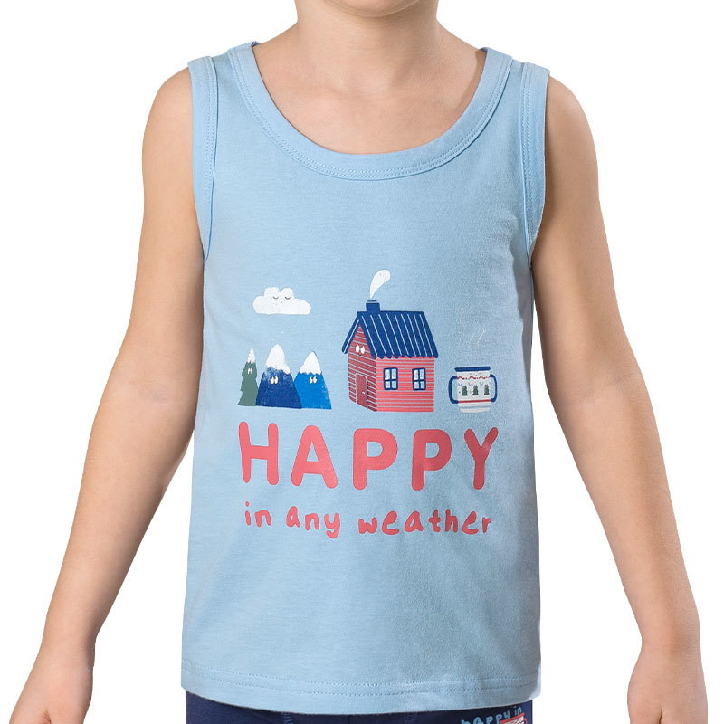 Состав: 100%хлопокОписание: Вы в поисках качественного, красивого и удобного белья для своего ребёнка? Тогда наша майка в стиле "хюгге" для мальчика — именно то, что вам нужно. Модель выполнена из 100... Показать описание% хлопка. Натуральная ткань отлично дышит, она мягкая и приятная на ощупь. Благодаря правильному крою изделие комфортно садится по фигуре — майку можно носить под рубашкой, джемпером, свитером. Горловина и проймы обработаны в тон — они прекрасно сохраняют форму и остаются в первозданном виде в течение длительного времени. Модель выполнена в актуальном, очень красивом васильковом оттенке и декорирована уютным принтом с позитивным текстом. Принт эластичный и мягкий — великолепно переносит многочисленные стирки. Перевод: "Счастлив в любую погоду". Такую майку можно носить не только как нательное бельё, но и как домашнюю одежду, для сна или майку для летнего отдыха. А голубой цвет делает ее универсальной. Красивый и практичный выбор для вашего ребёнка. Станет замечательным подарком, который способен вызвать искреннюю радость у каждого ребёнка, оставив незабываемые воспоминания о любом празднике и принося массу удовольствия каждый день.
