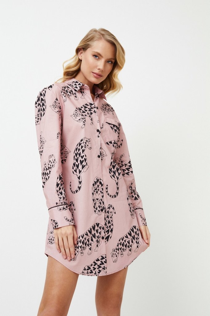 Представляем ночную рубашку Brenda, в которой комфорт и веселье идут рука об руку. Ночная рубашка на пуговицах сшита из розовой хлопчатобумажной ткани, украшенной игривыми черными тиграми в виде серде... Показать описаниечек. Она имеет закругленный низ, нагрудный карман и черную окантовку на карманах и манжетах рукавов. Приготовьтесь ко сну в ночной рубашке Brenda, которая превратит каждую ночь в веселое приключение. Изделие выполнено из текстильного хлопка.