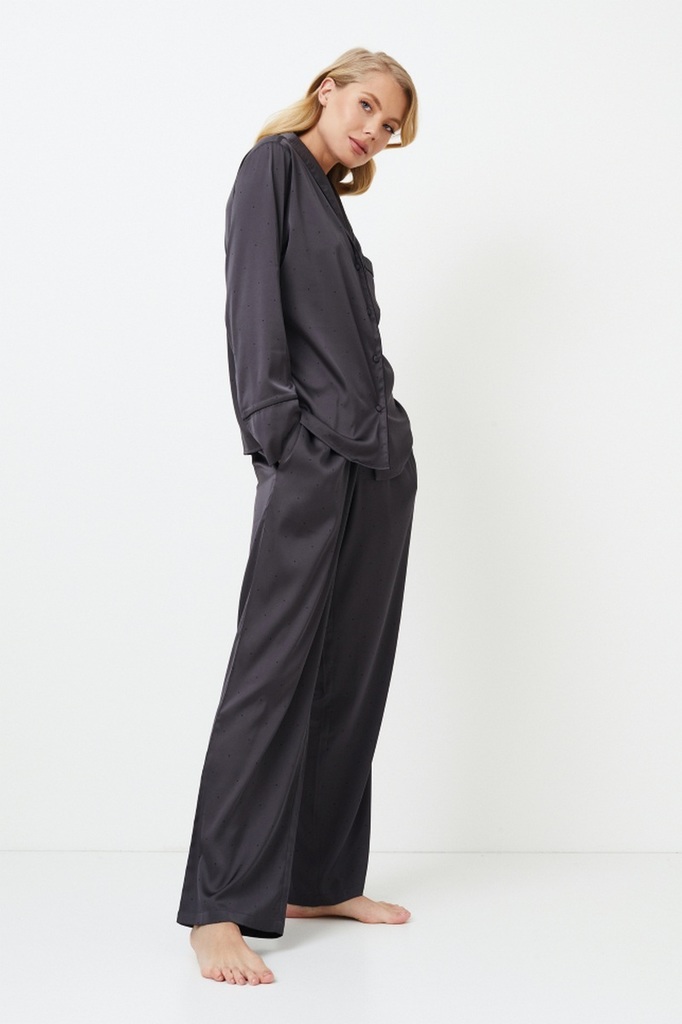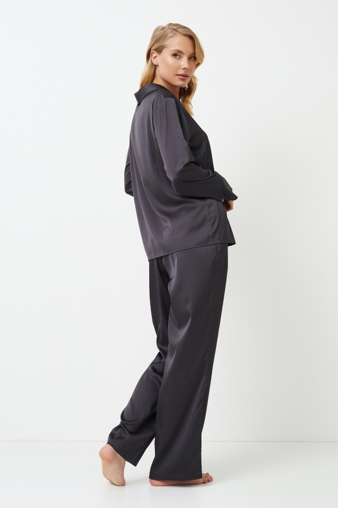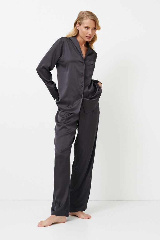 Представляем длинную пижаму Agatha - темный и смелый выбор для тех, кто предпочитает минимализм. Рубашка с длинными рукавами застегивается спереди на пуговицы и имеет соблазнительный округлый V-образн... Показать описаниеый вырез горловины, а широкие брюки с карманами и тонким регулируемым поясом придают комплекту элегантности. Комплект украшен черной окантовкой по краям. Пижама изготовлена из блестящей плотной темно-серой ткани в мелкий черный горошек, которая создает ауру элегантности и гламура, идеально подходящую для тех, кто любит выделяться даже в ночной тишине. Раскройте свою внутреннюю драму с длинной пижамой Agatha.