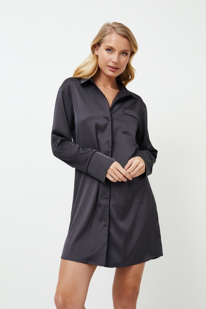 Представляем ночную рубашку Agatha, темный и смелый выбор для тех, кто предпочитает минимализм. Платье с длинными рукавами застегивается спереди на пуговицы, имеет классический воротник и украшено чер... Показать описаниеной окантовкой по краям. Ночная рубашка, сшитая из блестящей плотной темно-серой ткани в мелкий черный горошек, создает ауру элегантности и гламура, идеально подходящую для тех, кто любит выделяться даже в ночной тишине. Раскройте свою внутреннюю драму с ночной рубашкой Agatha.