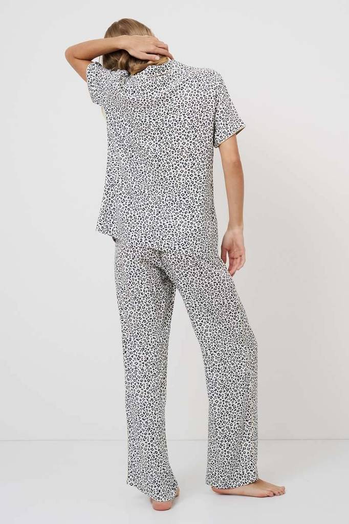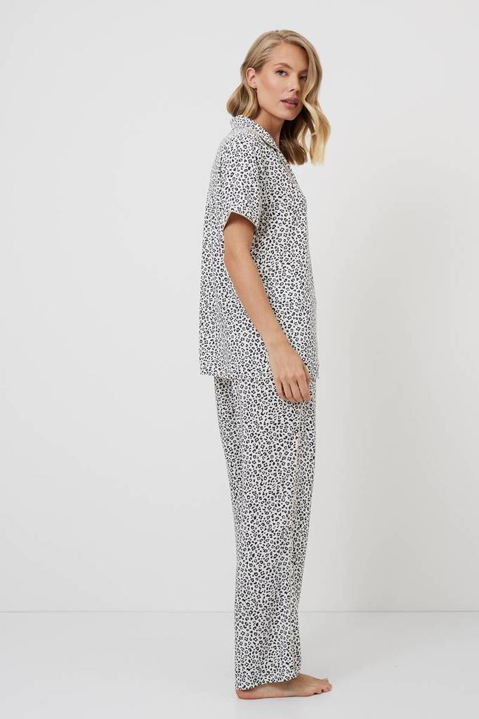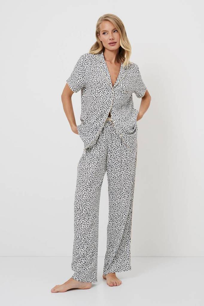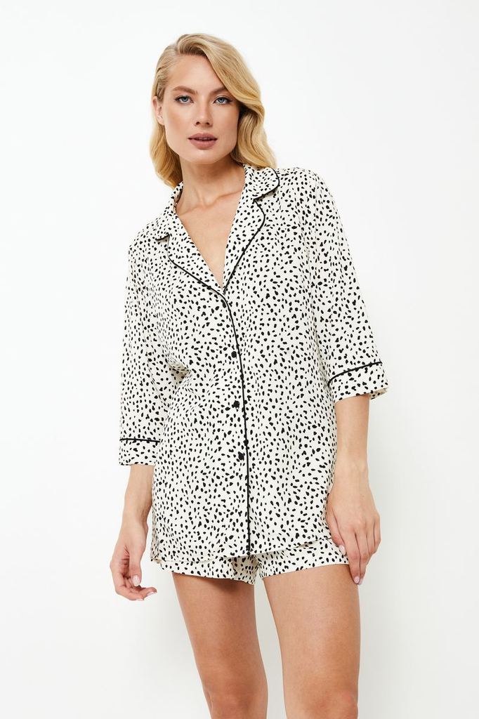 Представляем вашему вниманию длинную пижаму Beatrich — воплощение безумной мечты. Изготовлена из лёгкой вискозы с шикарным серым леопардовым принтом. Рубашка на пуговицах с короткими рукавами, манжета... Показать описаниеми и V-образным вырезом. В сочетании с брюками в тон с обычным поясом, украшенным коричневой лентой и боковыми манжетами, этот комплект излучает необузданное очарование. Дайте волю своему воображению в нашей длинной пижаме Beatrich, которая идеально подойдёт тем, кто не боится мечтать.
