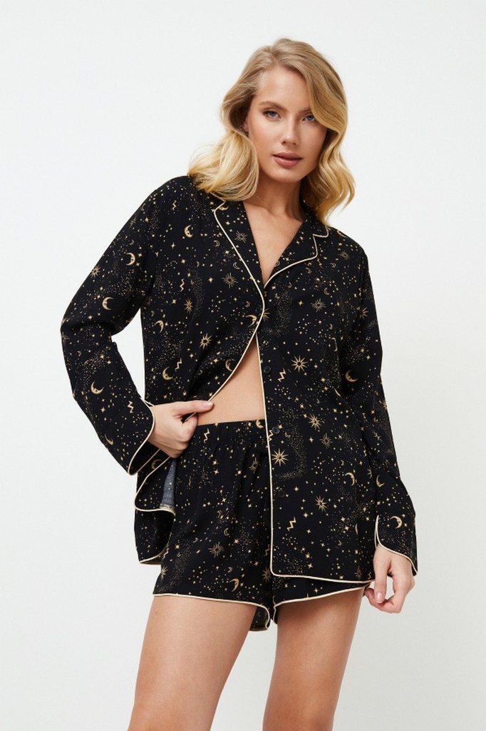 Представляем вашему вниманию короткую пижаму Рубашка с длинными рукавами застегивается на пуговицы и имеет стильный V-образный воротник с контрастной окантовкой по краю воротника спереди, низу и рукав... Показать описаниеам. Шорты с разрезами по бокам и окантовкой в тон по нижнему краю. Пижама потрясающего черного цвета, украшенная золотыми орнаментами ночного неба, оживляет образ перед сном. Подарите себе ощущение ночного очарования с короткой пижамой Alexandra, каждая деталь которой излучает небесное очарование. Ткань - вискоза.