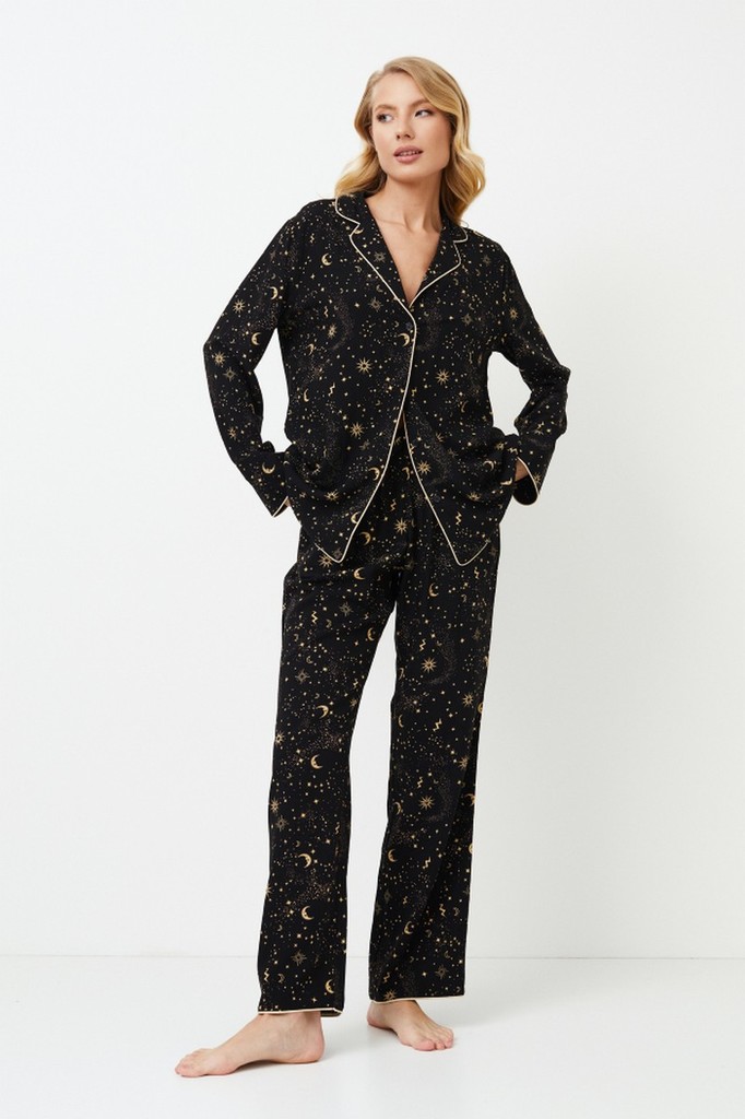 Представляем вашему вниманию длинную пижаму Alexandra, в которой уют сочетается с шиком, создавая ощущение блаженства перед сном. Рубашка с длинными рукавами застегивается на пуговицы и имеет стильный... Показать описание V-образный воротник с контрастной окантовкой по краю воротника спереди, низу и рукавам. Брюки классического кроя с удобными карманами и окантовкой в тон по нижнему краю. Пижама потрясающего черного цвета, украшенная золотыми орнаментами ночного неба, оживляет образ перед сном. Насладитесь ночным очарованием в пижаме Alexandra pajama long, каждая деталь которой излучает небесное очарование. Ткань - вискоза.