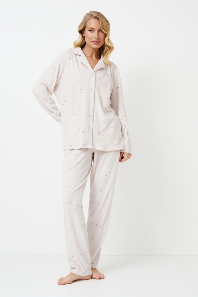 Представляем длинную пижаму Ariya, в которой сладость сочетается со светом звезд. Для создания уюта закутайтесь в нежный пастельно-розовый цвет. Топ с длинными рукавами, застегивающийся на пуговицы, и... Показать описание V-образным вырезом горловины обеспечивают комфорт и элегантность, а весь пижамный комплект украшен очаровательным рисунком в виде звезд, вдохновленным мерцающим ночным небом. Почувствуйте себя уютно в этих брюках классического кроя с эластичным поясом и карманами. Наденьте длинную пижаму Ariya, и пусть ваши мечты мерцают волшебством тысячи звезд.