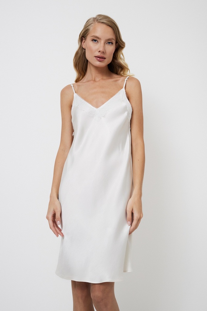 Окунитесь в мир элегантности и мечтательности в ночной сорочке Aphrodite. Она изготовлена из блестящей вискозы и создана для того, чтобы вы чувствовали себя такой же великолепной, как греческая богиня... Показать описание, в этот особенный день. V-образный вырез, украшенный кружевом, регулируемые бретели и вытачки на груди обеспечивают удобную посадку, а глубокий V-образный вырез на спине добавляет привлекательности. Строчки по центру спинки и по бокам добавляют замысловатые детали к однотонному жемчужному полотну. Вдохновлённая элегантностью греческой богини Афродиты, эта ночная сорочка воплощает неподвластную времени красоту, что делает её идеальным выбором для невест, стремящихся к элегантности и изяществу в свой особенный день.