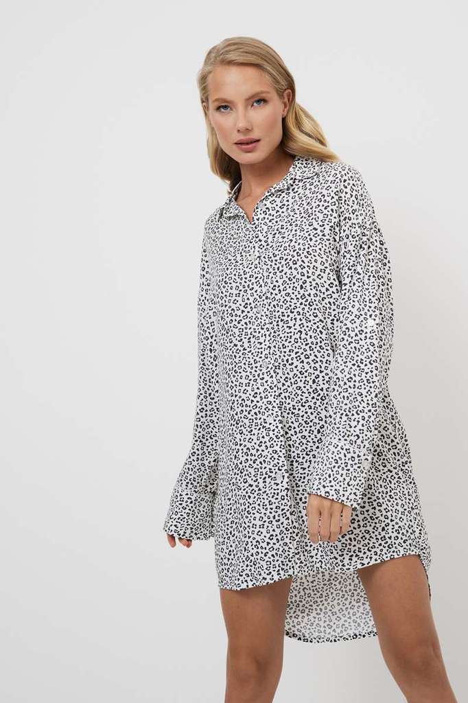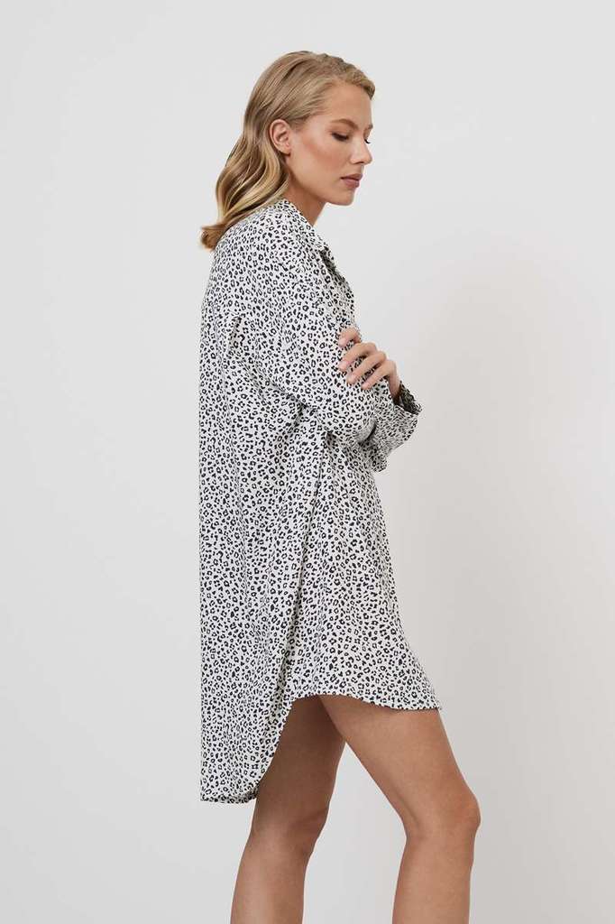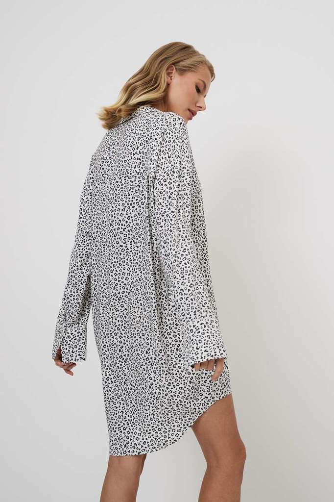 Представляем вам ночную сорочку Bella, в которой смелость сочетается с элегантностью и ноткой дикости. Она изготовлена из лёгкой вискозной ткани с шикарным серым леопардовым принтом. Она отличается ок... Показать описаниеруглым низом, более длинной спинкой с кокеткой для создания привлекательного силуэта. Украшена подходящей по цвету окантовкой на манжетах рукавов. Позвольте своей внутренней дикой кошке свободно резвиться в ночной рубашке Bella, в которой каждый изгиб подчёркивается дерзким очарованием.